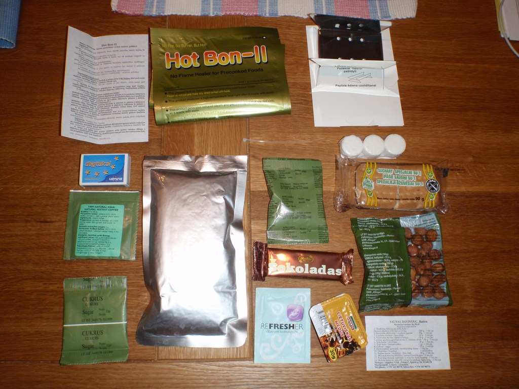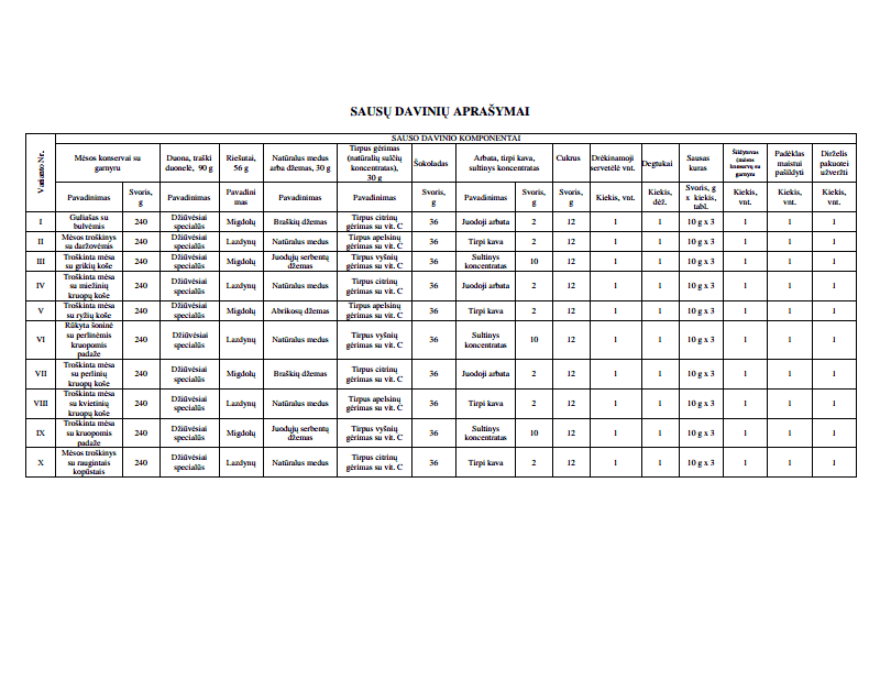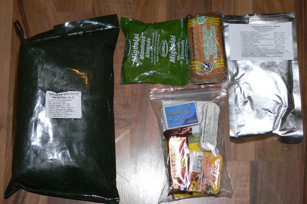 The Lithuanian sausas davyinys (literally, "dry ration") is based on the US MRE, consists of a single meal plus accessories for one soldier. It comes packed in a thick green plastic bag measuring 180 x 300 mm and weighing between 635-685 grams. Most items are ready-to-eat; the main meal is in a polylaminate retort pouch weighing 240 g, of which at least 100 g is meat. IT may be eaten hot or cold, and the bag contains both a water-activated chemical ration heating bag and a pack of fuel tablets with a disposable folding stove.
