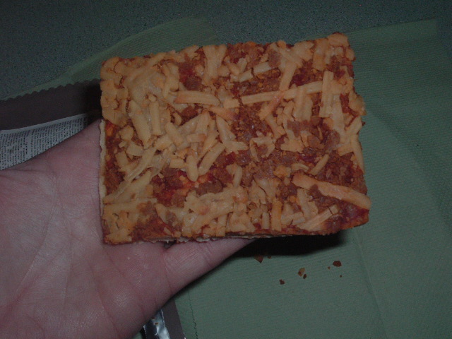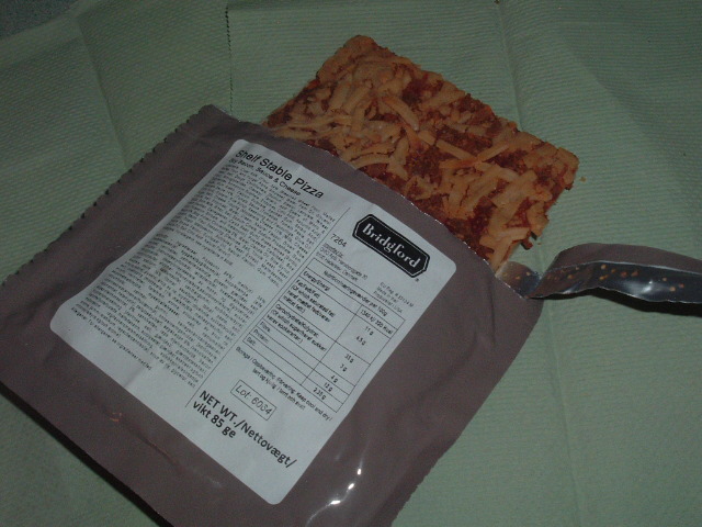 Here we go. Opening and taste test of the Bridgford shelf-staple cheese pizza. Does the job it was meant to do, but after one bite, I'm on the way to Domino's, just to get the taste out of my mouth. Norwegians, you have at it. Good luck. I give it a C+, for what it is. Like Crocodile Dundee said, whatever.