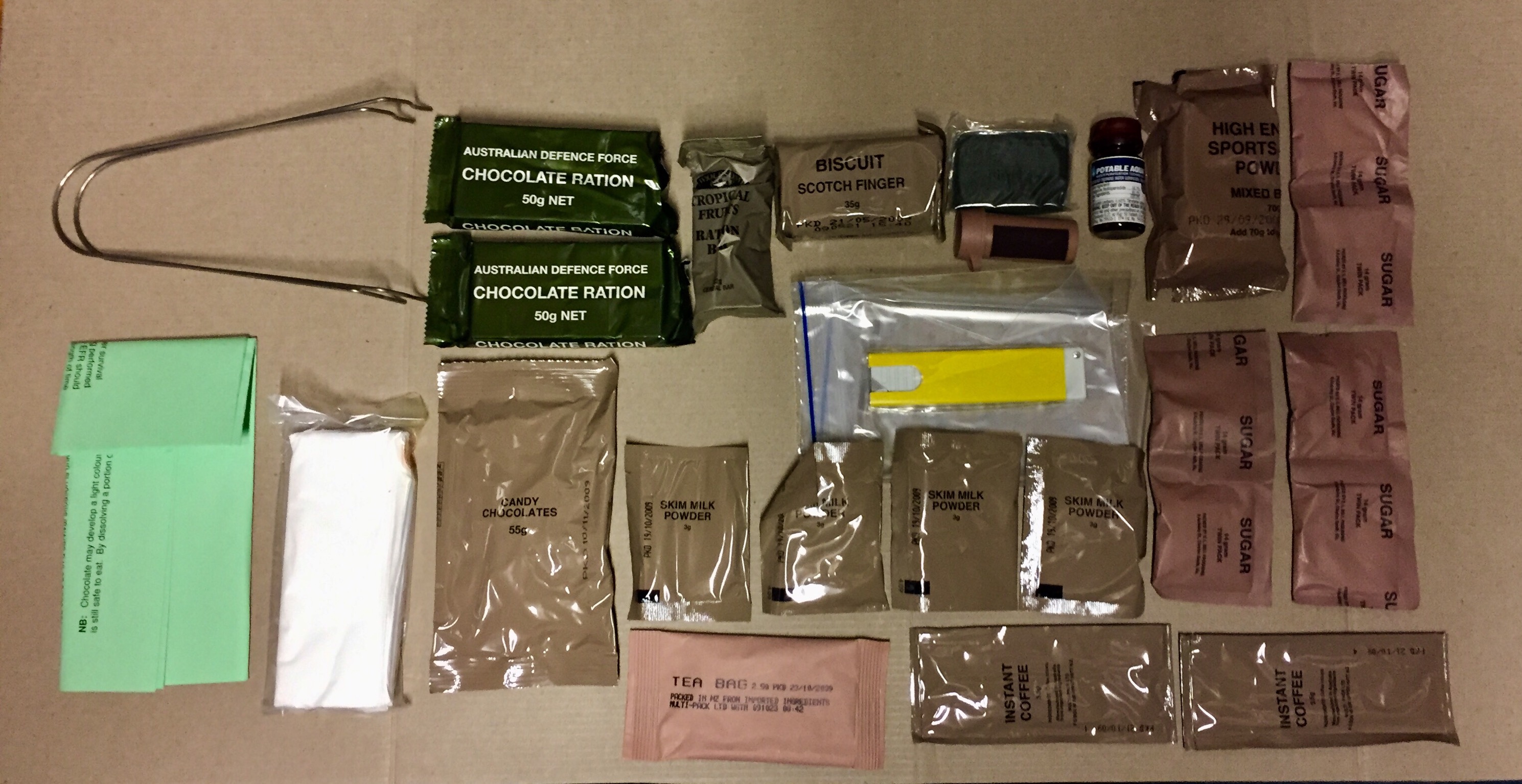 Unless it was sold for a bunch of money, I cannot see why someone would go through the trouble to remove the OD paint from an authentic Aussie Flying Rat and re-seal it with the same tape in a such an immaculate manner, filled with some knock-off surplus components. I don't really know about that. If so, kudos to whomever for their creativity on re-purposing and duping someone on a ration. I've been victim to weirder. Old canvas pouch Vietnam War-era LRP's pouches from dead stock getting re-filled with 1998 Wornick RCW components. Or a super well-faked K ration filled with armor vienna sausages and lance crackers among other civvy snacks all from the mid-80s. Gotta find the photo set to that one because it was odd.