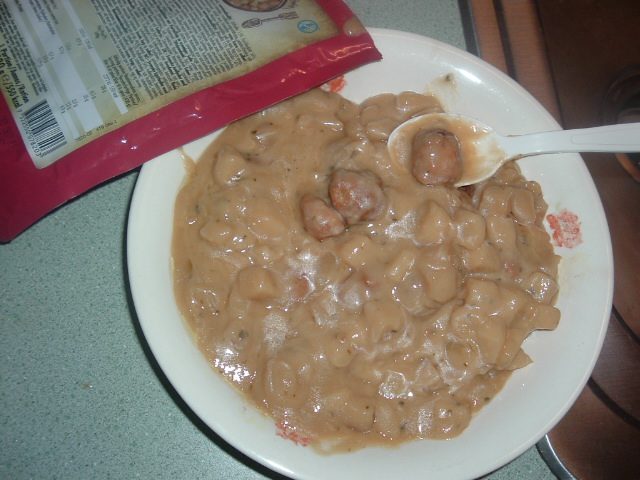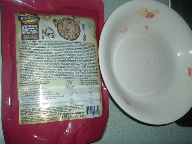 If going to try a Swedish ration, might as well get the one with the Swedish meatballs. 430 gram. There were 12 little meatballs, same size as US MRE Meatballs in Marinara sauce. Lots of potato chunks. Excellent stuff. Two thumbs up. :D