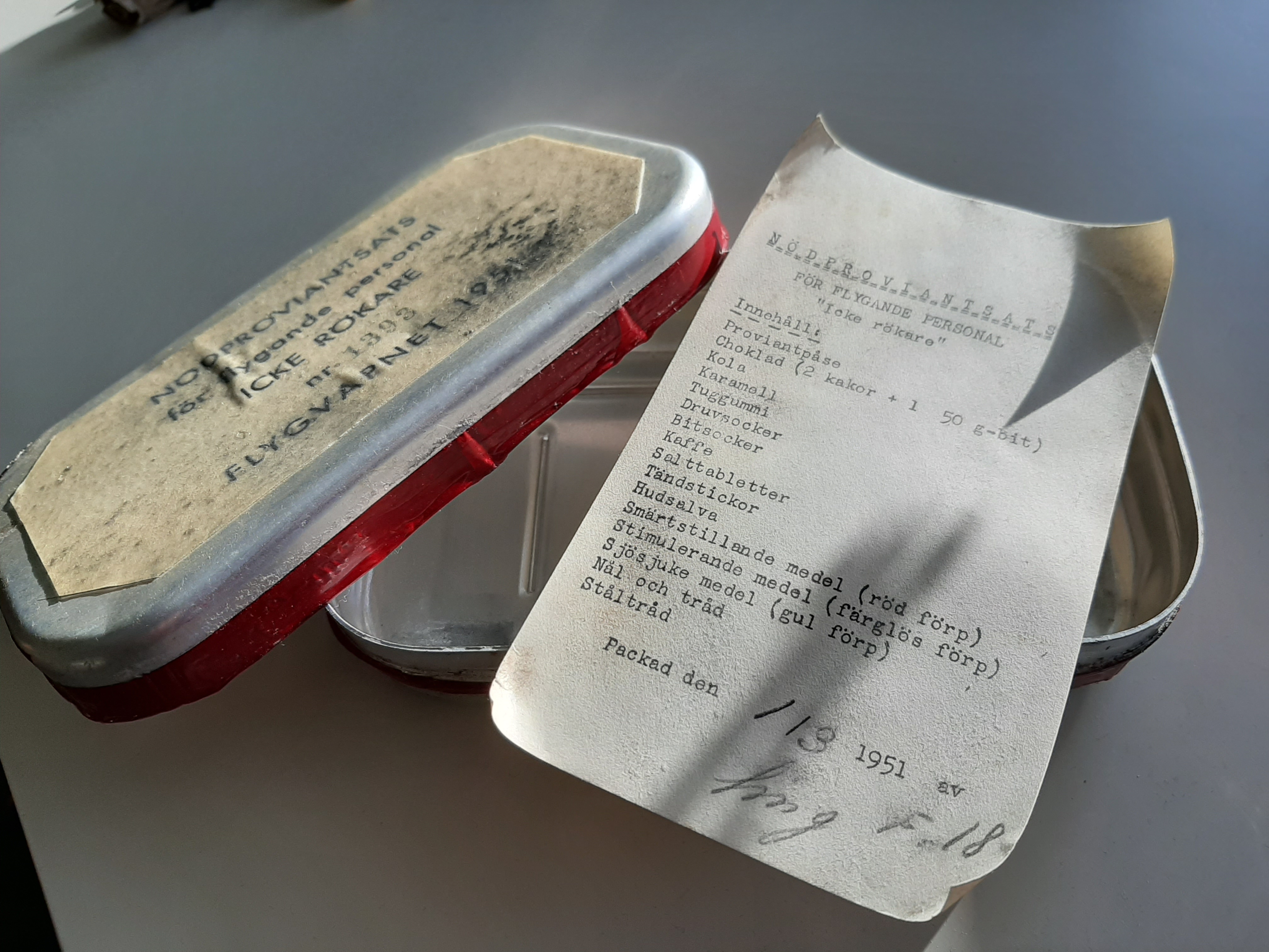 I have a Swedish Emergency Flight Ration from 1951. This ration was in the lifeboats with some other supplies inside the planes. unfortunately my ration is almost empty. Only a paper with the contents listed is left.