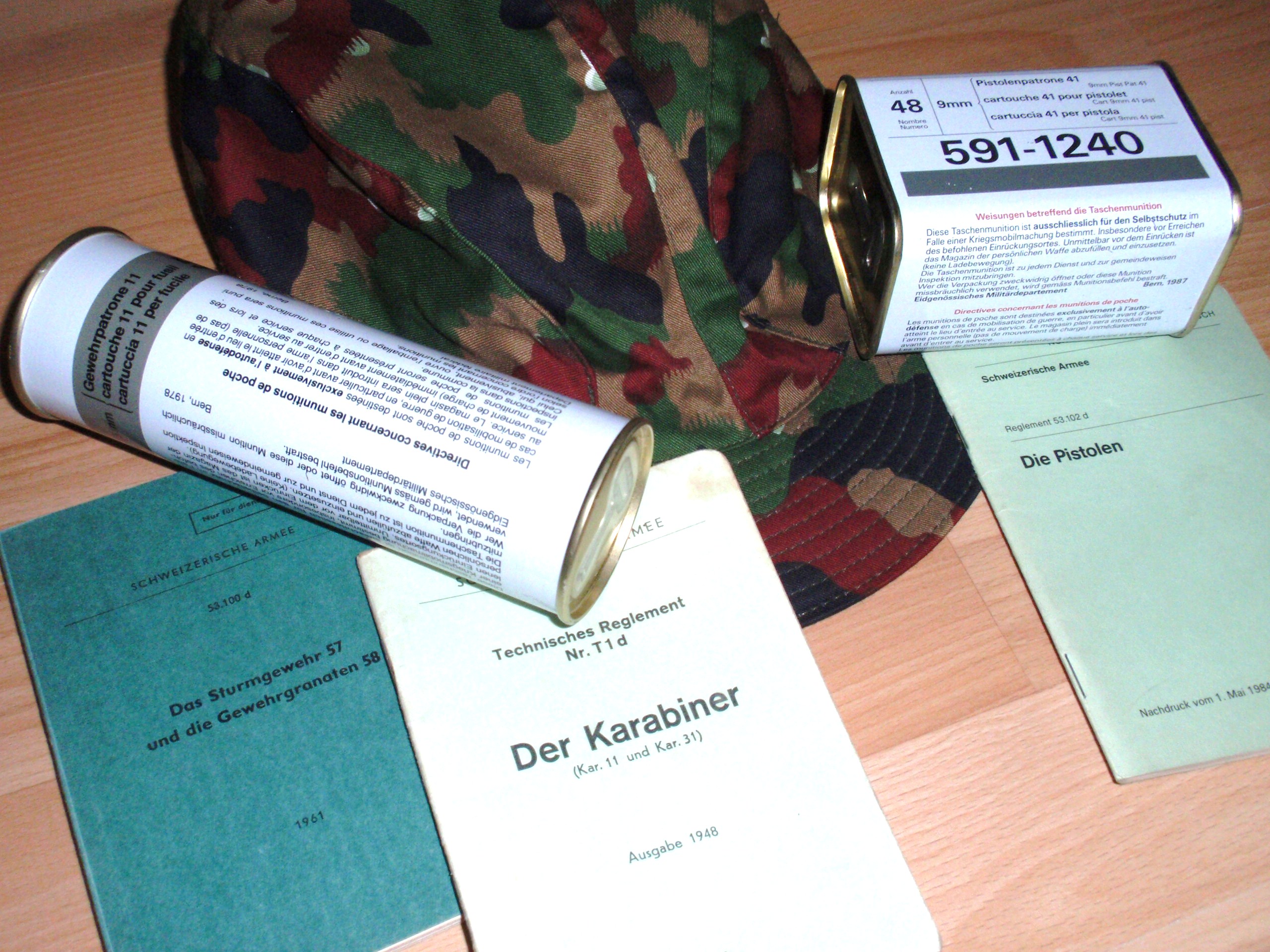 I guess the Swiss Army is the only army that has survival AMMUNITION rations! These tin boxes are called ‘Taschenmunition’ (pocket ammonution) and are given to the soldiers when they end their active duty time. The boxes go together with the gun, be it a 9mm handgun, the older type Stg 57 or the newer Stg 90. These boxes may only be opened in the case of an emergency i.e. war time. After reserve duty the boxes must be returned in closed condition. Soldiers returning opened boxes will pay high fines or worse!