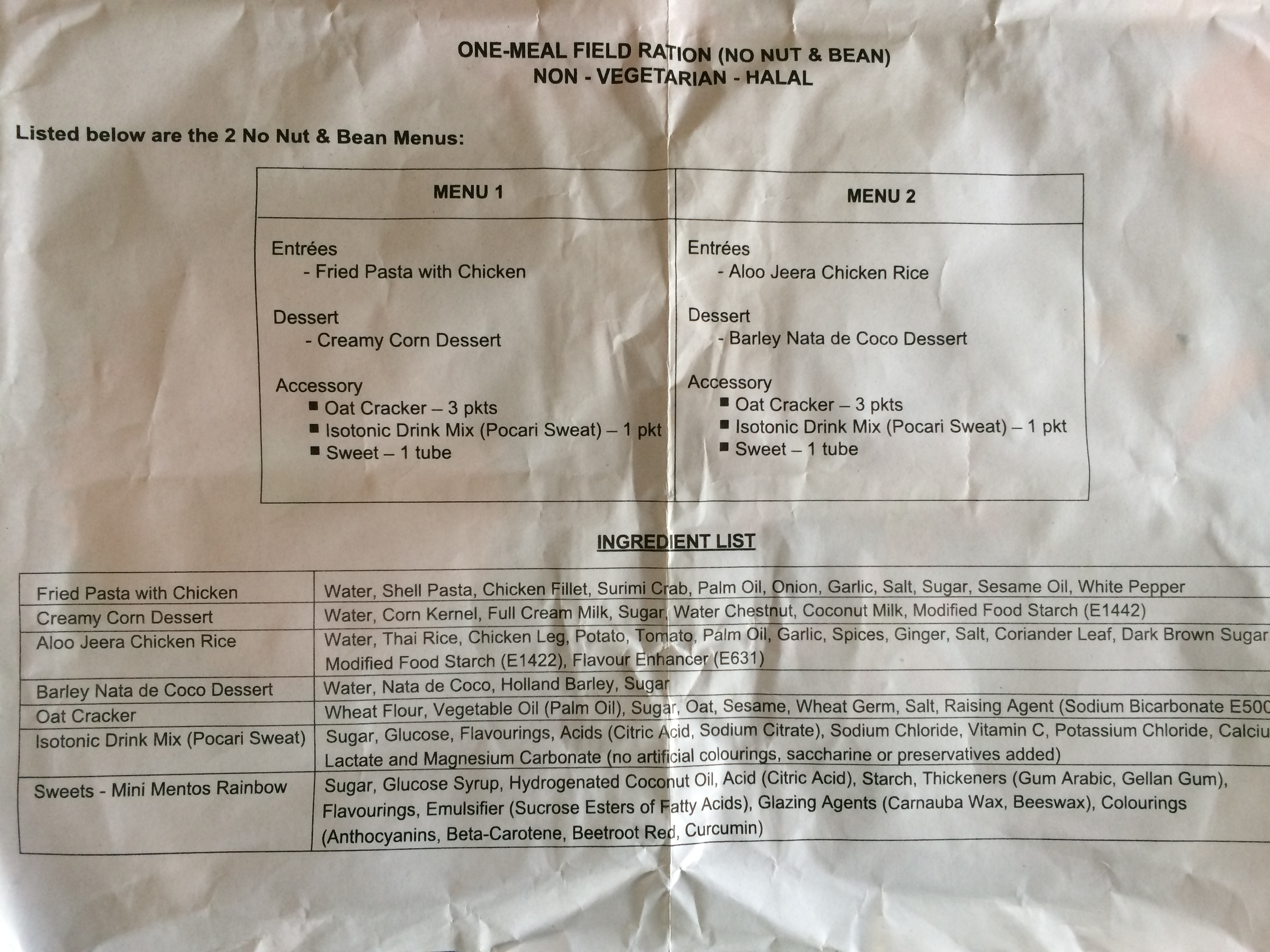 Presented here is the menu insert: with a pleasant addition - a complete ingredient list of what is inside the ration
