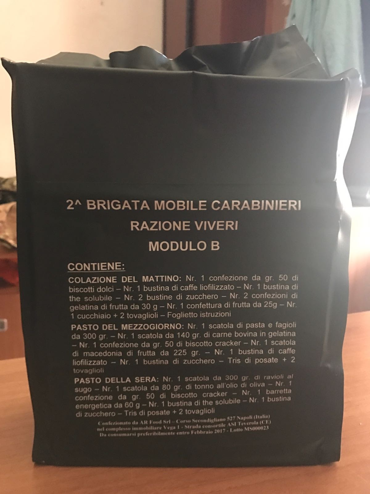 Yes the Carabinieri is a special unit for Embassy defense, VIP protection, Military and riot Police and one Airborne assault unit. They have their own rations because they are usually close to cities. The difference is there is no Esbit stove, no cordial, and a few other differences (minor).Asger wrote:Watts can you post pictures with your explanations? Isn't Carabineri part of Italian Armed Forces so what makes this module B a Carabineri version? I thought Carabineri word is clear and visible not just on the bag but also on the boxes inside...