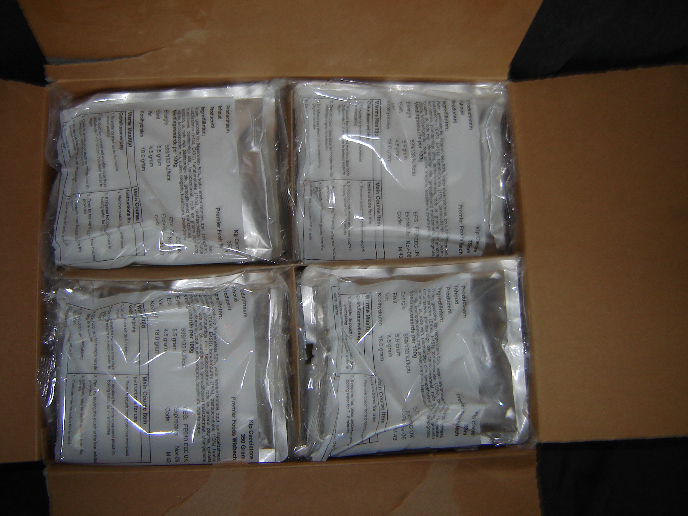 They appear to be made in the UK. The pouches are also exactly like the ones from the british rats. I don't now if they are still in use. So far these weren't handded out to us. Only the 400 gr's cans.