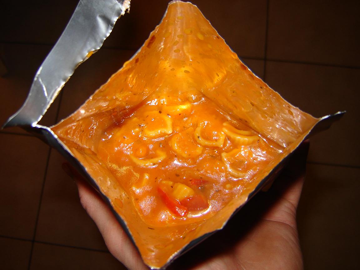 I ate the chicken cacciatore (whatever that might be). And it was great! Good taste, smelled ok. Lots of juices and a well filled meal (350 gr). About one third of meat, a third of vegetables and a third of pasta (clam shaped).