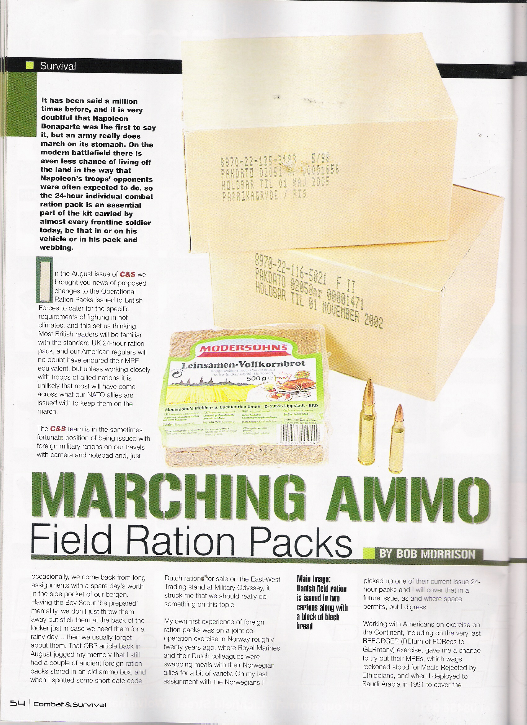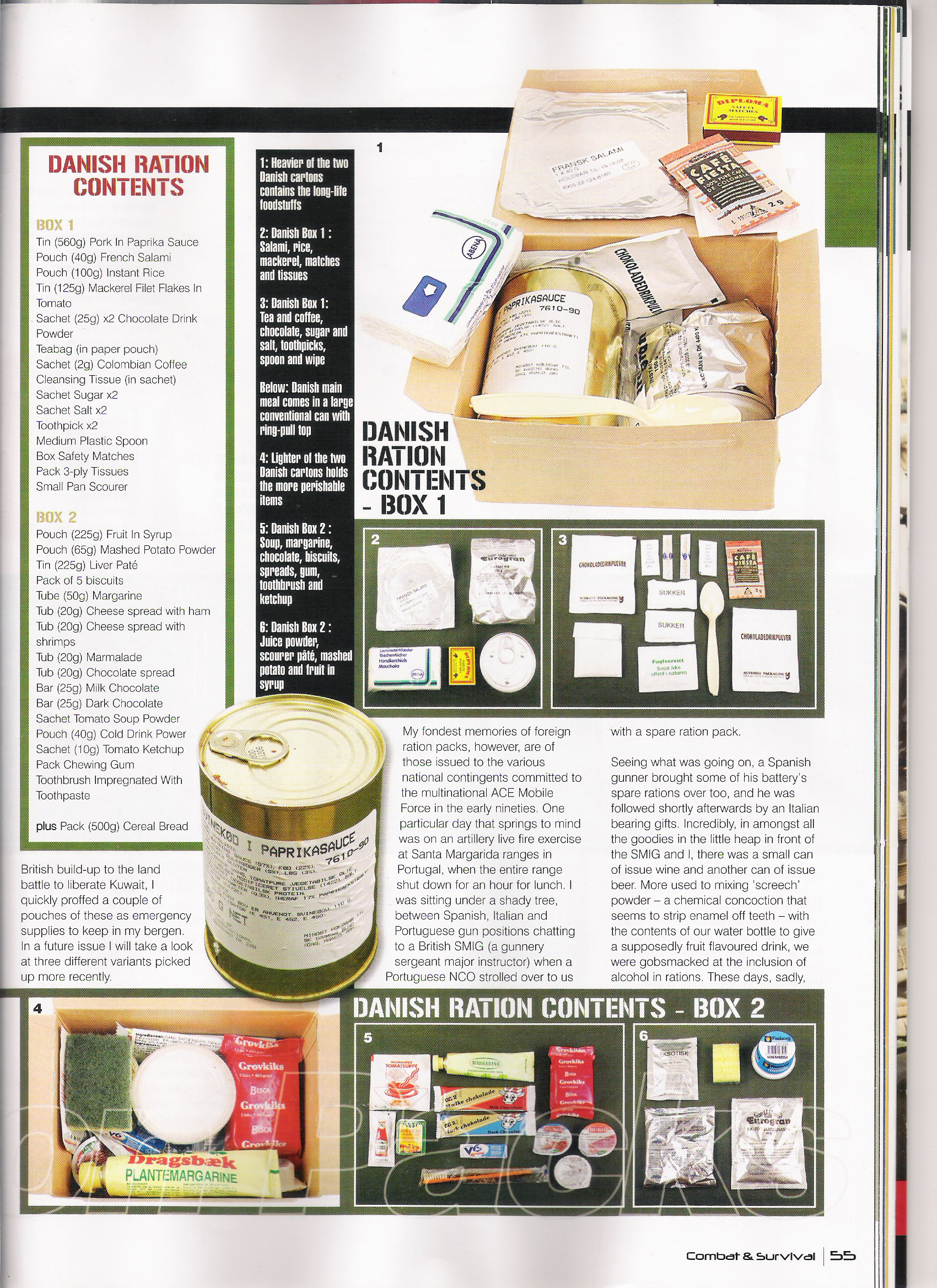 2 pages on Danish Rations full of pictures; One Pack exp 02 the other 2005