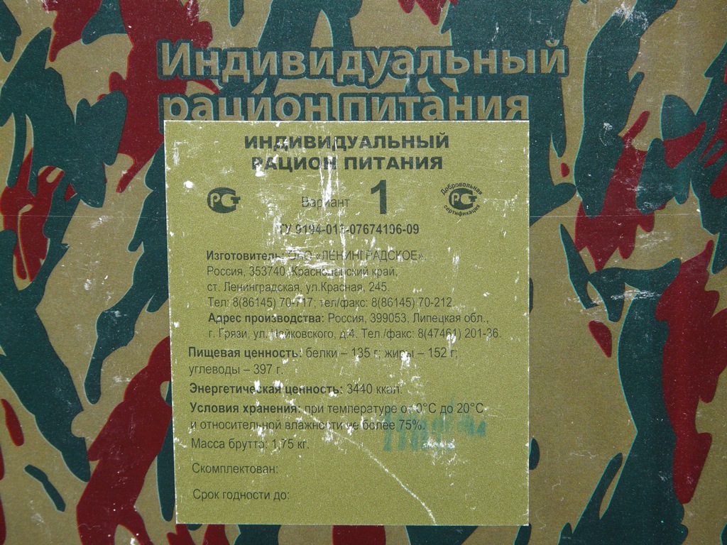 I particularly like "All products for certification by major Bilyk, natural and very tasty."Bypah wrote:"with porridge "Slavic", beef stew, green peas with ground meat, crackers, cream cheese, fish, tea, sugar, and more..." This is a simple translation of some of the menus....rebraunjr wrote:I It seems that the Russian Army has altered its battle rations after the South Ossetian War of 2008. We have all seen photos of the "lunch tray with a handle." My cousin says there is also a version with the new Russian digital camo. Apparently these new rations come in multiple menus as well unlike the IRP-B.