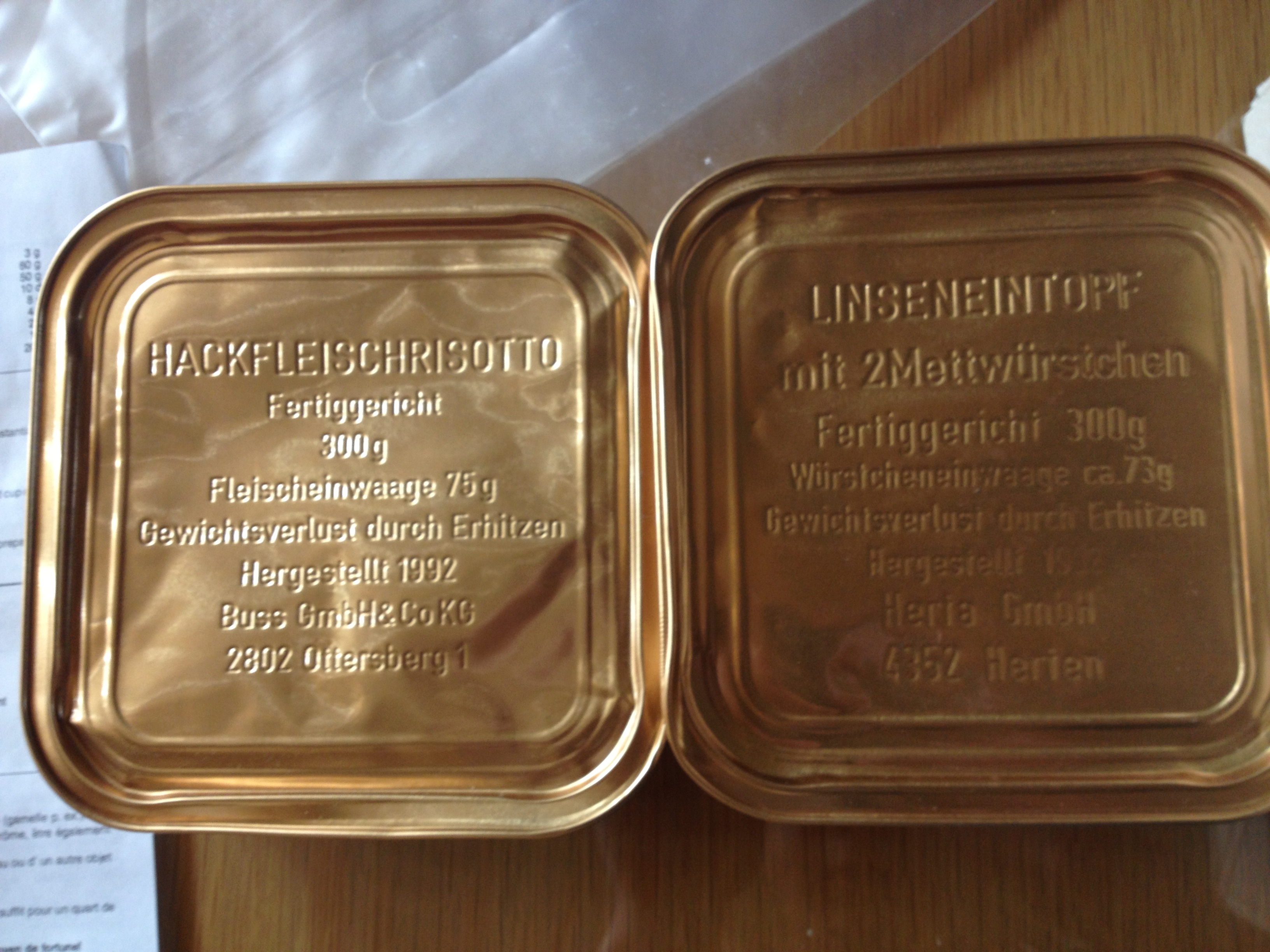 Yeah, mine looked like that too before I opened it, everything was in mint condition. The small cans are the same, one bulging and the other one not. The Risotto seems to have formed a block that can move around in the tin tho.Name_not_found wrote:Mine was pretty good at about 20 years