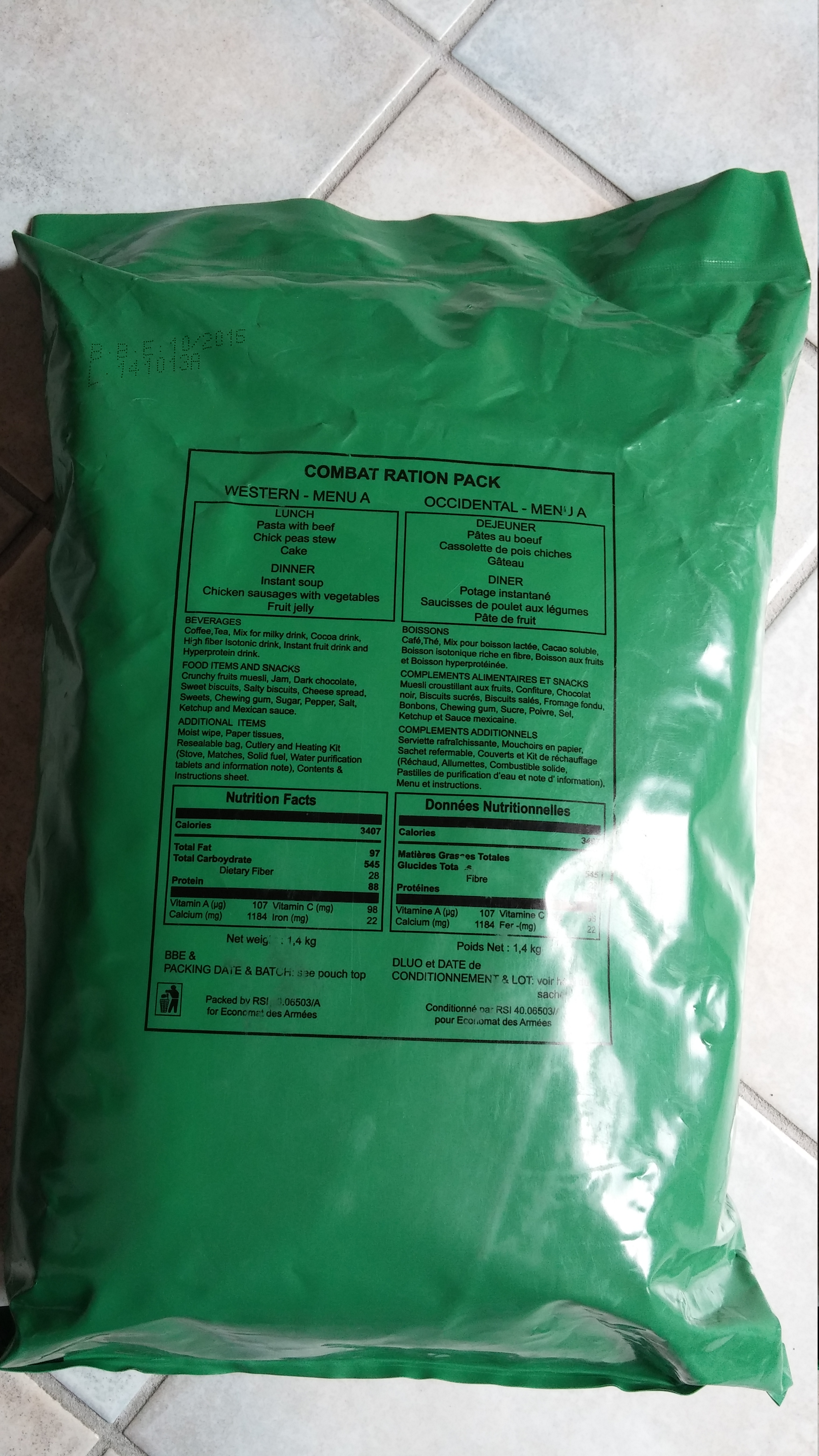 I found this one at ebay, but i've never seen this kind of Combat Ration before and have Problems to identify it. Itś packed by RSI for Economat des Armées. Is it a civil defence Ration of the french army?? Has anyone an idea?