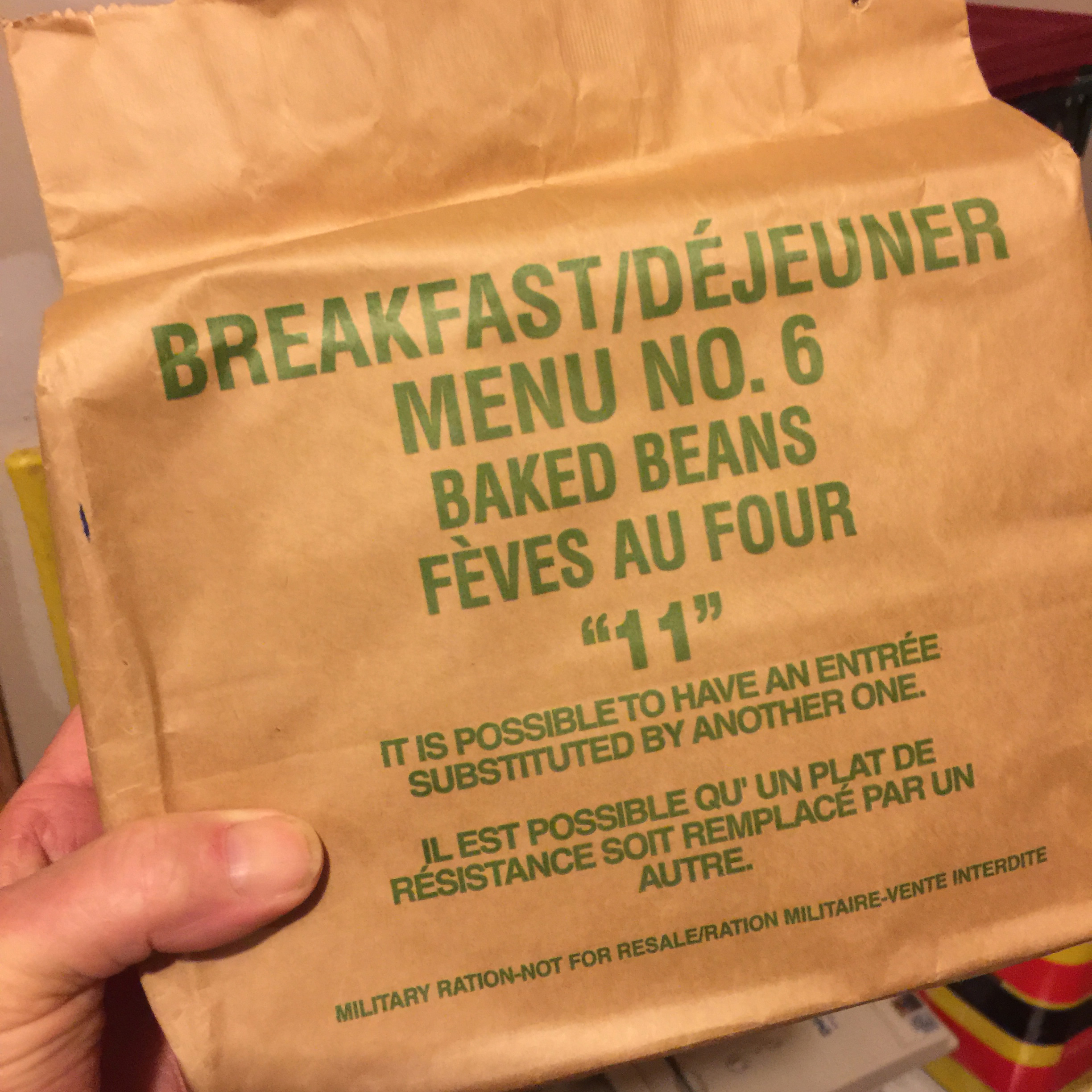 I have donned the Festive Light-up Electric XMas Tree Hat, the holiday jazz tune-mix is on the box [Eatha Kitt- "Santa Baby" right now], and I am ready to "live-blog" my review of the Canadian IMP Breakfast/Dejeuner Meal No.6 "Baked Beans" (Feves au Four) "11"