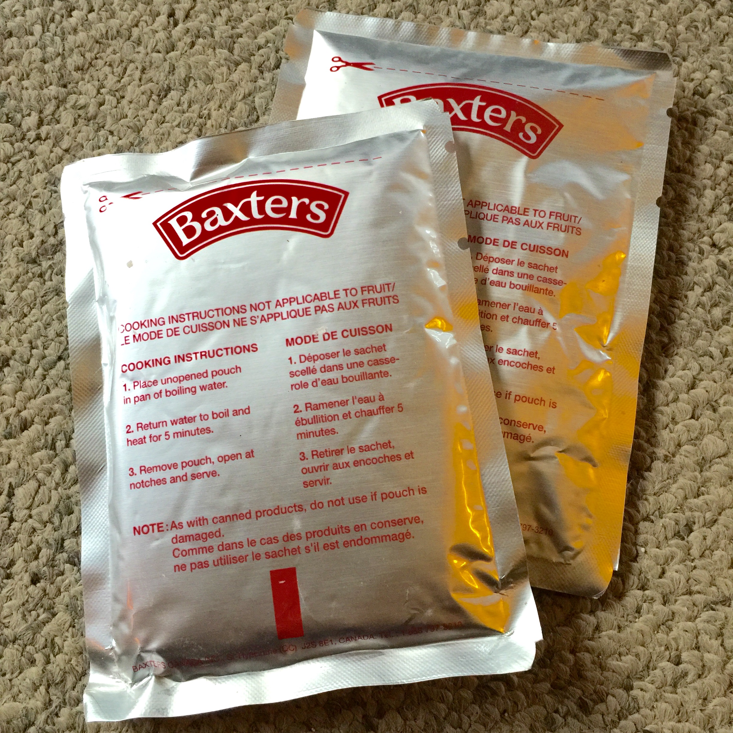 BTW- I talked with kman earlier in the week, and he did a "fix" on photos to set them with a smaller, more managable size that can once again be "clicked-on" to go full-rez.The pack out was just what we have seen in other IMP reviews: main of Beans, side of peaches, bread, jam x2, coffee, cocoa, lemon drink, creamers and sugar, S&P, wipe, matches, long toothpick, gum and a candy. This one has a Tabasco condiment as well. I really like the bag pack that the IMP uses better than the US mode. Sandwiching everything to the center between the boxed main and sides means that the whole pack is squarer and just more "ship-shape" than the higgety-piggity MREs. Seems like cookies and the like would have less chance of damage in handling under field conditions. [Momentary Aside: this sacrifice of my taste buds is not made any easier by the fact that my daughter just texted me from Florida where they are having crepes for breakfast...] The Beans and the peaches were packed by the Canadian branch of Baxters out of St-Hyacinthe(QC) and the bread by RoPack from Montreal.