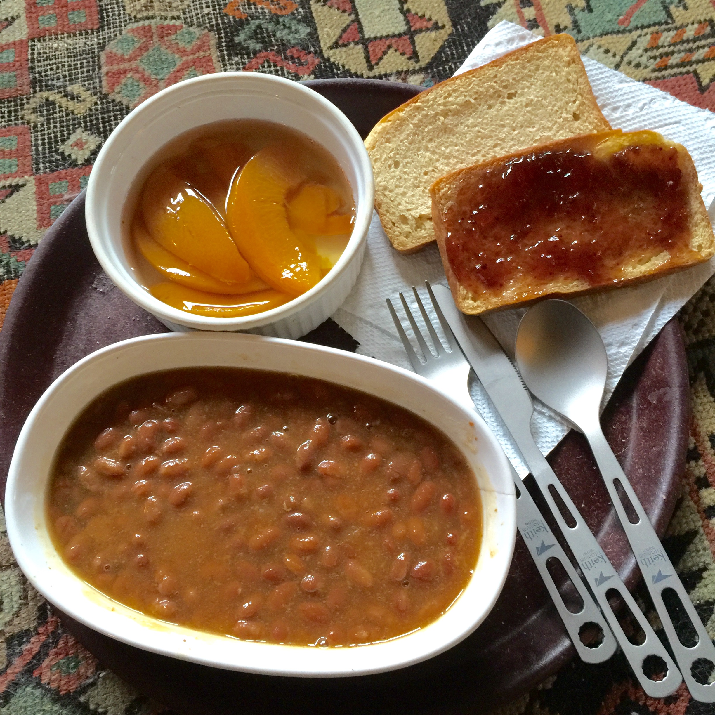 Here is the meal in full. I passed on coffee and the like since they are all pretty much one-and-the-same. However, I ate with the new set of Titanium "Entrenching Tools" I gave myself as a Christmas present.