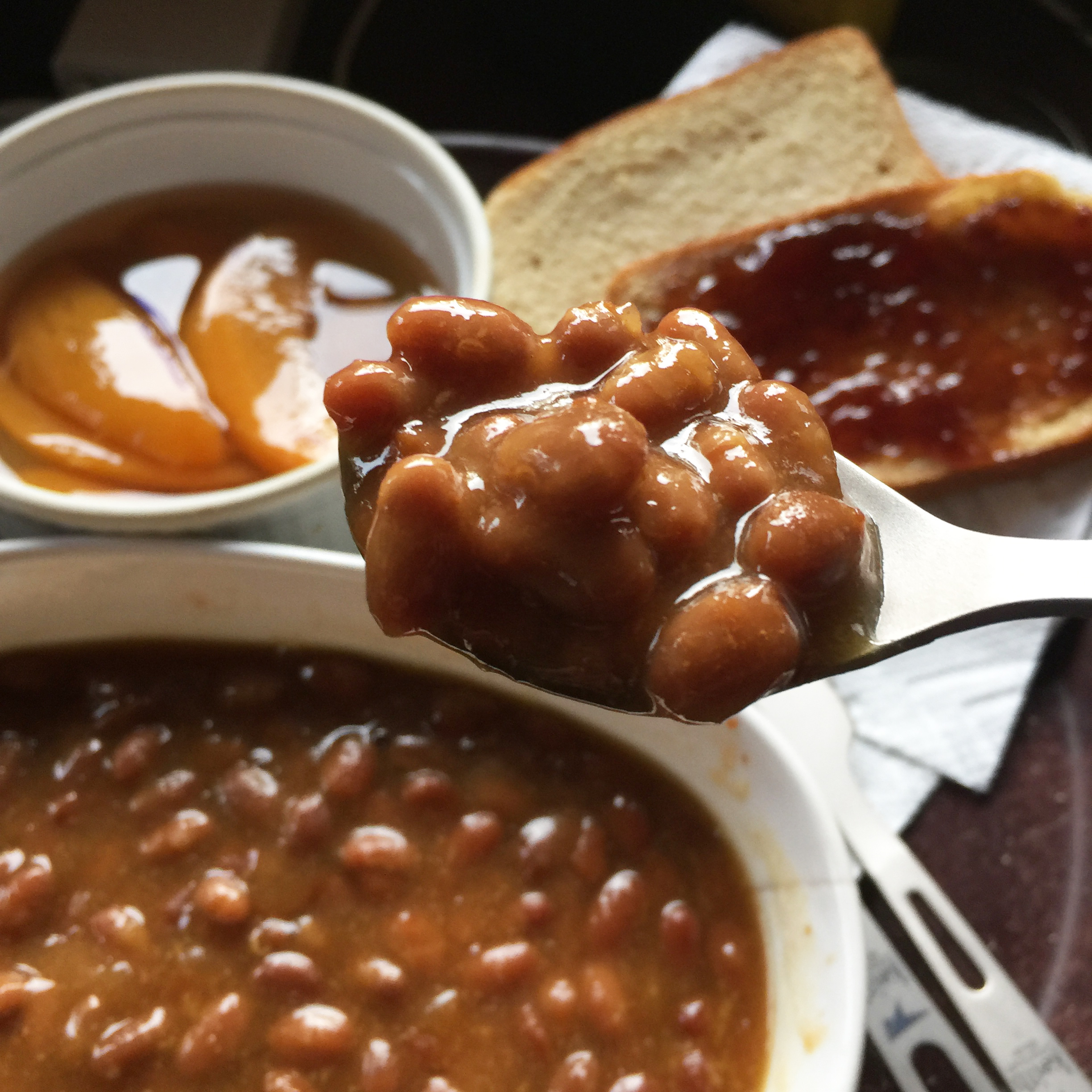 So, all of those details aside, I'm happy to report that the beans in the Canadian IMP breakfast are far closer to the B&M baked beans that I so love, than they are to the other canned varieties. While not as sweet, [I don't believe they actually use molasses] they are also nowhere near as loose, thin and over-sauced as most canned beans. You can see in the second photograph that a spoonful of these is thick with beans and a clinging sauce.