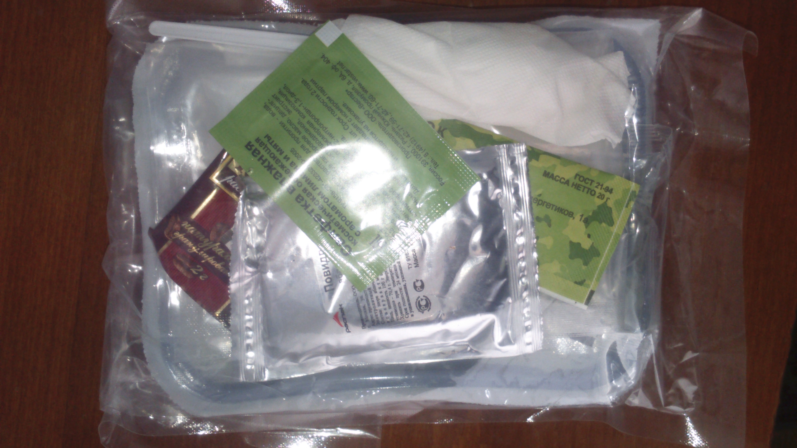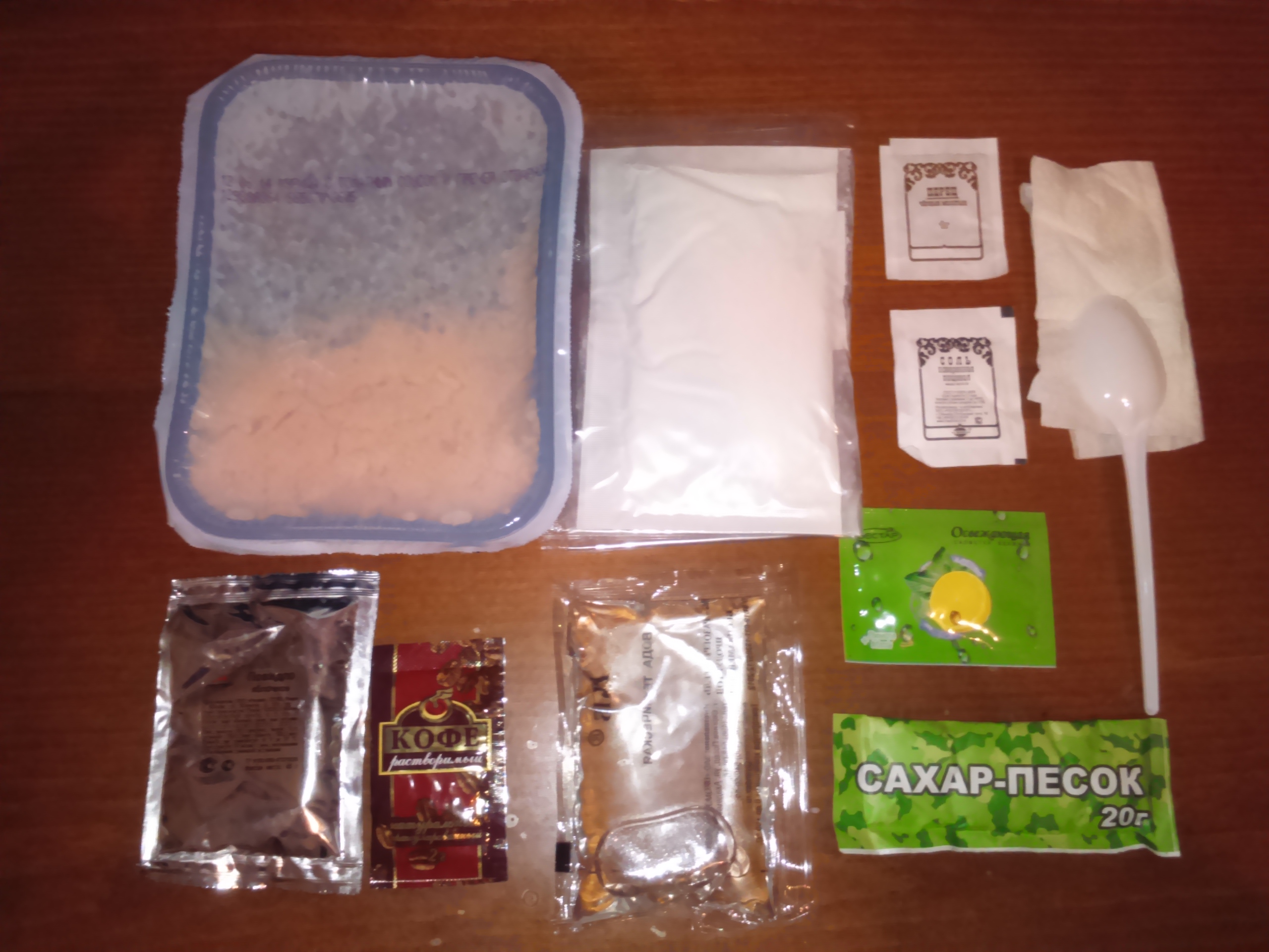 9. Accessories - 2 napkins, 2 wet towel wipes, a spoon, 2 self-heating elements, 2 packages of water Heats up very strongly. Stronger than the American MRE. Dinner: