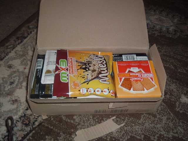 Here's a small pic. review. Totally yummy. The newer cracker-box palace has 3 diff. crackers, 3 salt, 3 chocolate and 2 sweet. You know I was going to bust this open for the Chili con Carne. It taste like Taco-Bell meat on steroids with extra large chunks of beef and kidney beans. The Barre Energy Peche-Abricot mini-bar, most excellent, just too small, like French, 20 grams. Thats all for now, full.