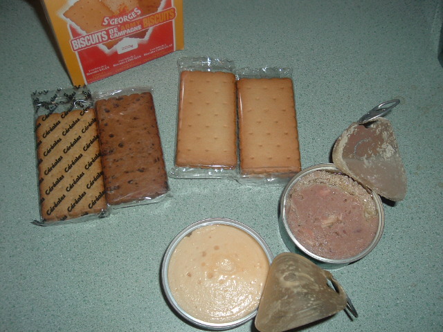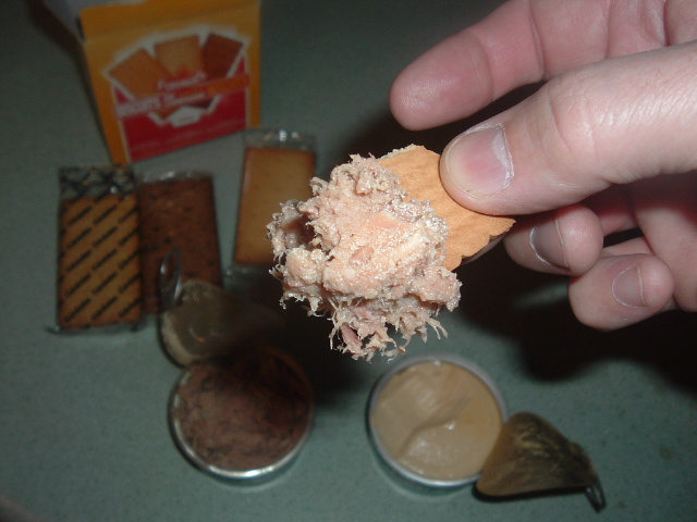 Opened the Cracker Box Palace, and tryed the duck pate and the fondue. The duck pate was not bad, makes me want to go outside and blast some of those Canada geese out of the sky, for the meat. The fondue was just that, runny cheese substance. I gave the fondue a 5 out of 10, for taste. Definately prefer a(fresh, less than 2 year) US GI MRE cheese pack to that.