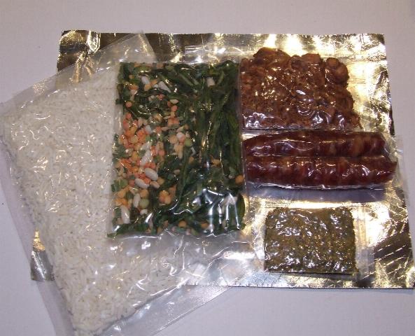 The PIR weighed 22 oz and provided 2600 calories when issued at the rate of 2 packages/day. Packed in a plastic-foil laminate bag, each PIR contained: a heavy-duty plastic bag with about 18 oz of pre-cooked, dehydrated rice; a cellophane envelope of dried fish or meat; a cellophane envelope of dehydrated Asian vegetables; a couple of small plastic packets of sauces or spices; and a vitamin pill. There were 5 menus: beef, fish-squid, shrimp-mushroom, mutton, and sausage.