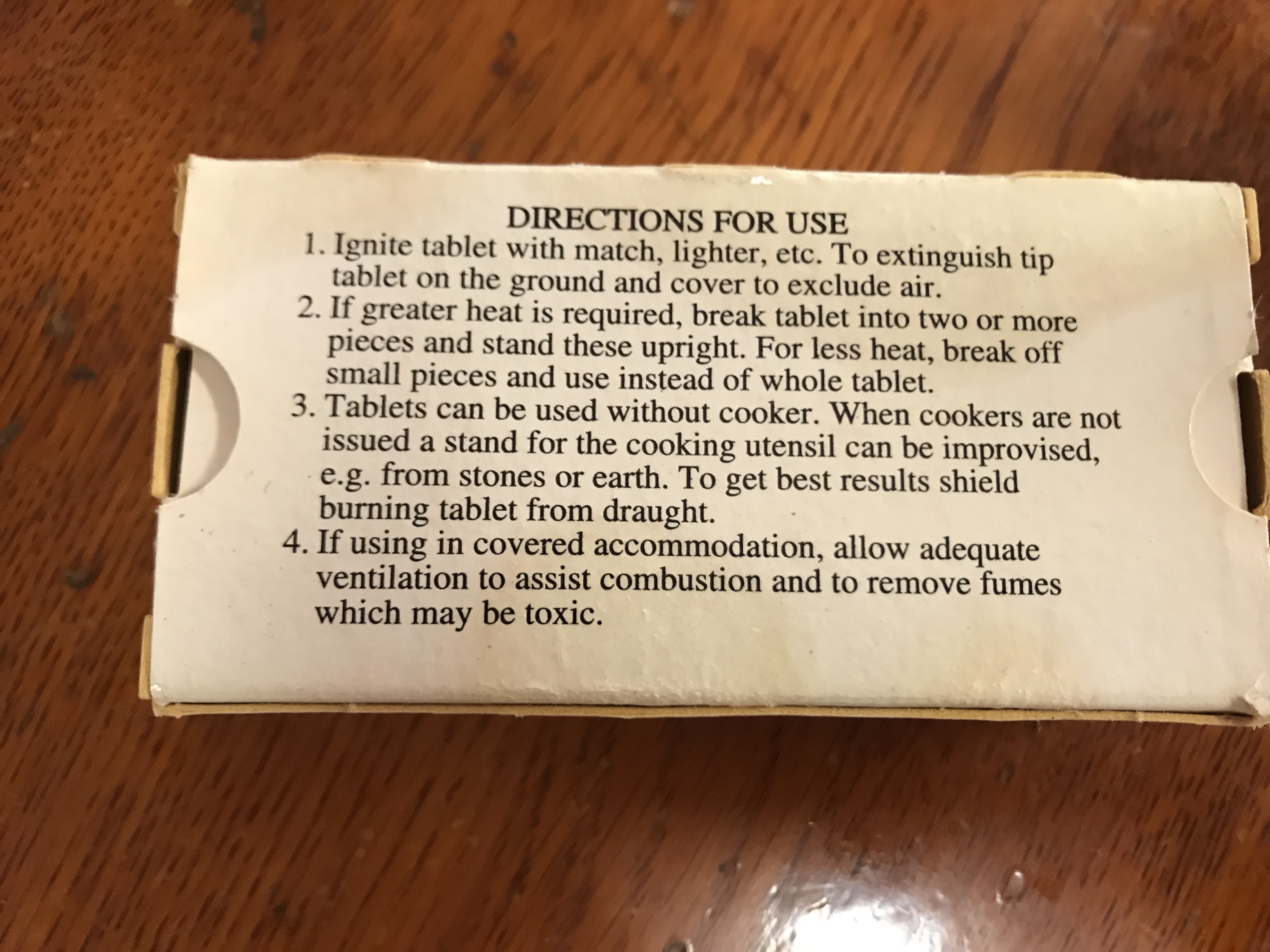 Glad to find some fellow Aussies on here! I was only in for a short time around 2011-2012, but we still used those hexamine tablets with our issued steel cup canteens. They were given to us separately. Eventually our section scrounged around the base and found a stock of those cookers you have pictured there, much better in my opinion. Pretty sure I got mine somewhere still. Also, the hexamine packaging is still a very familiar white box - not much has changed in their shape.