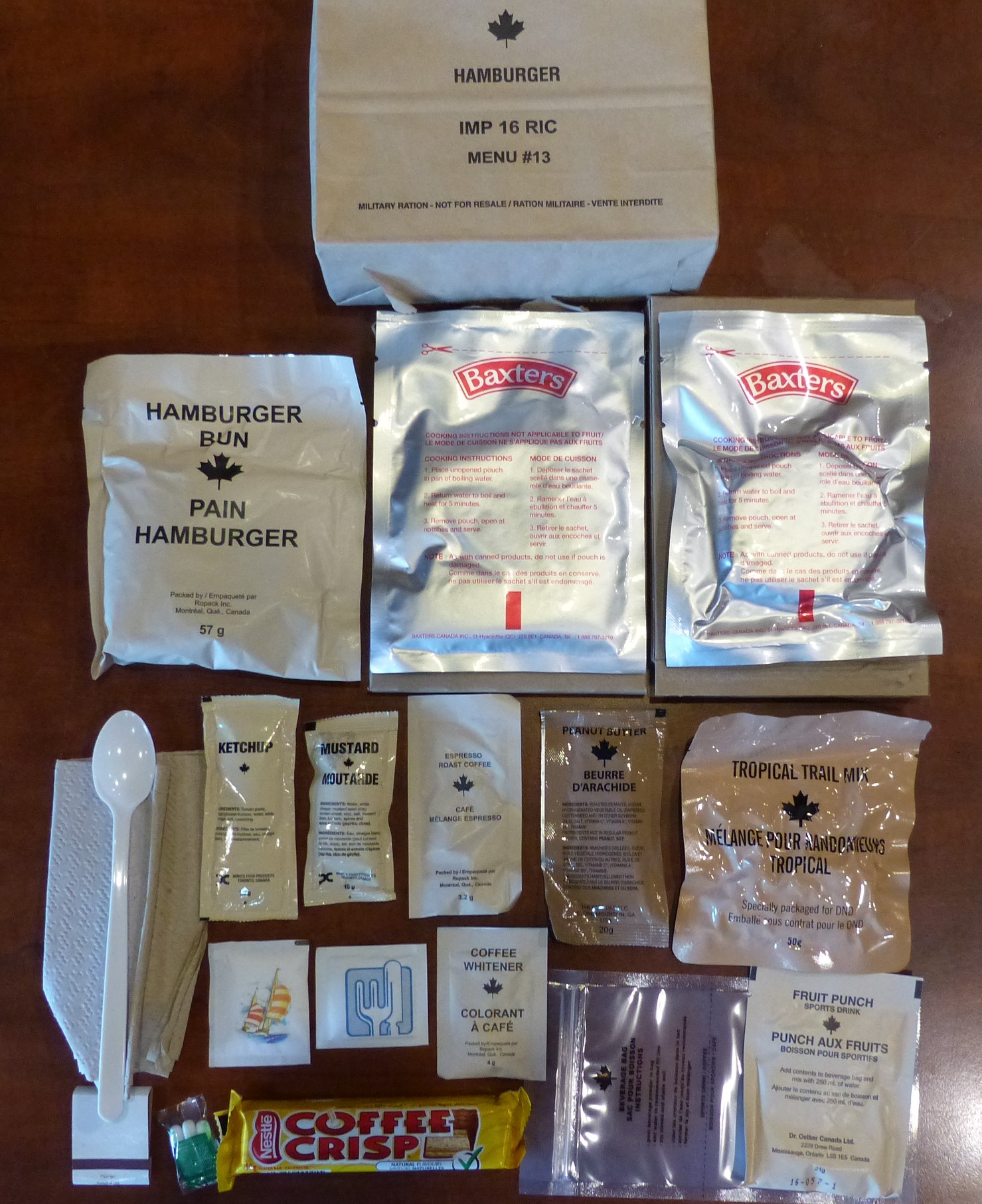 I've got the 2016 - Menu 13 - Hamburger at the ready for today's meal. Excited to see expresso in this one, and the coffee crisp is delicious. Little box of Canadiana.