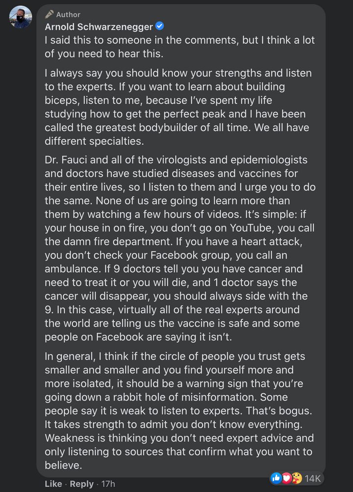 Governor Schwarzenegger responds to anti-vaxxers weighing science and responsibility. It is a legitimate critique of anyone who wants to defy sensible mandates and personal health and safety standards.