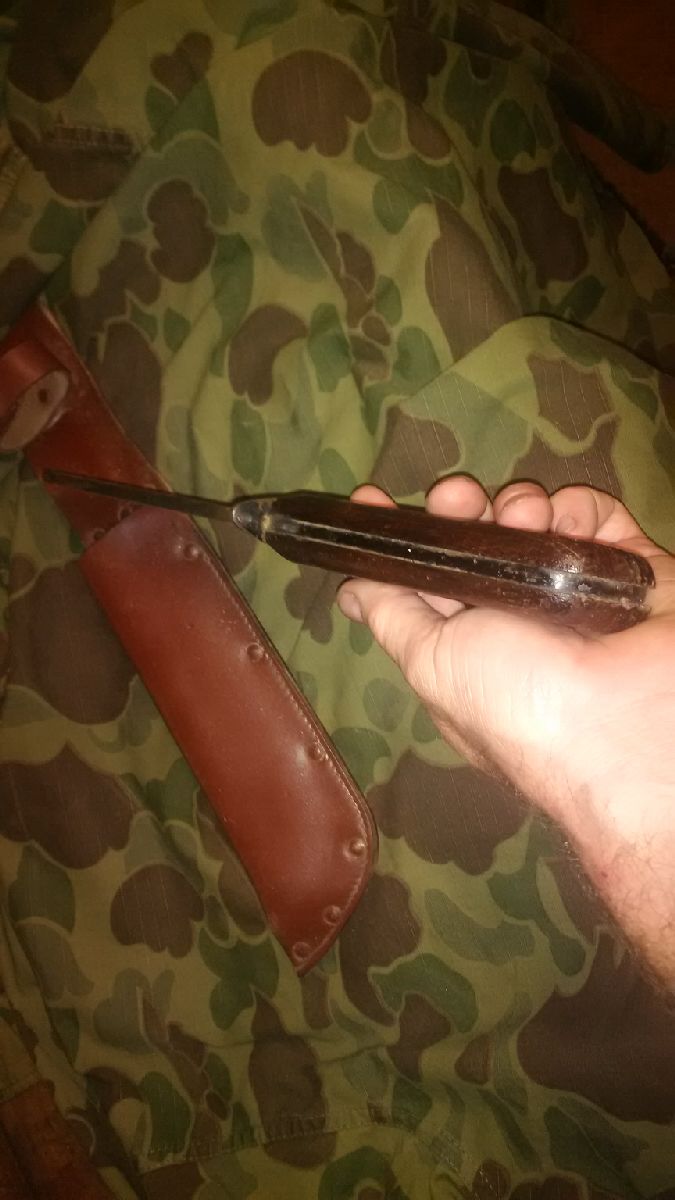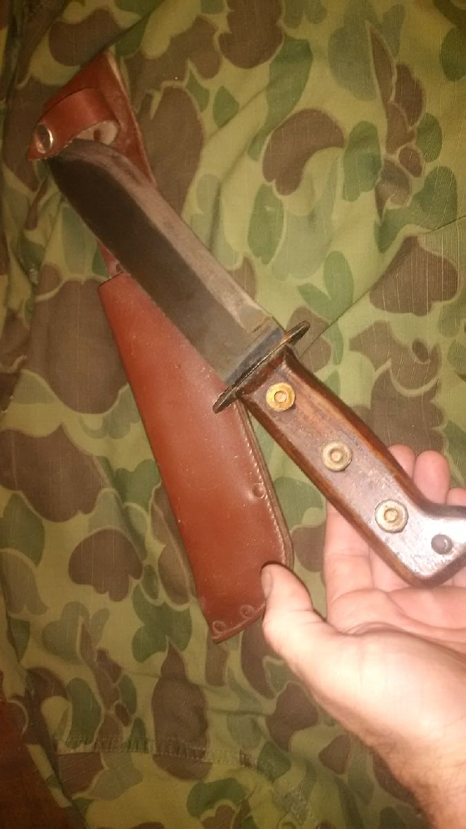 The Big heavy knife is a relic from 1980's Cold War days. Made In Sheffield England, British Army knife. I can cut small limbs, pry dig and do many camp chores. It is built like a Chieftain tank and nearly unbreakable
