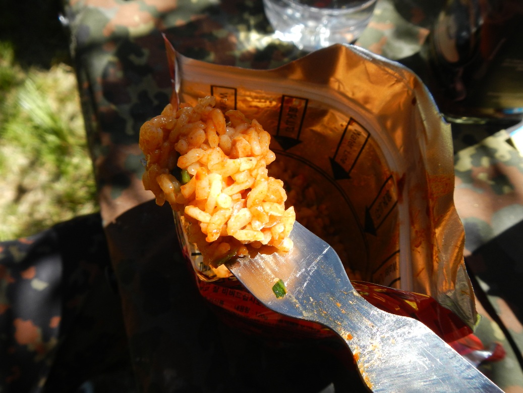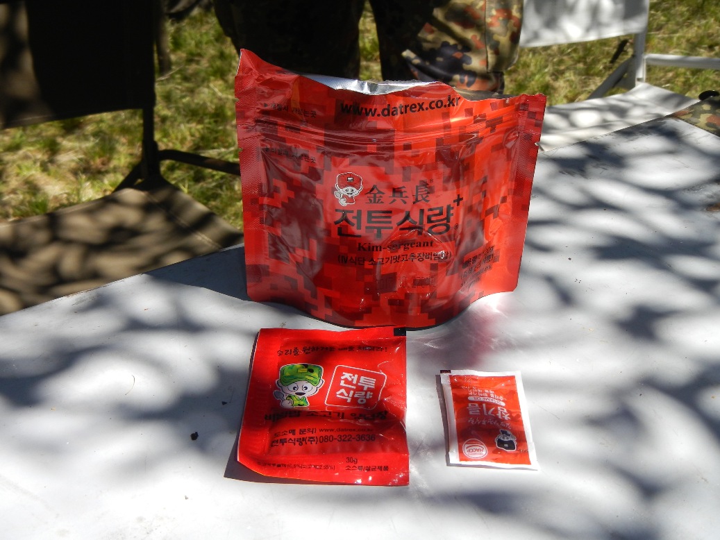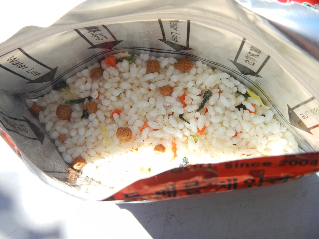 Camp site starts to get crowded Speaking of "crowded", time for lunch - a Korean freezedried ration this is how you spell "very spicy" over here: