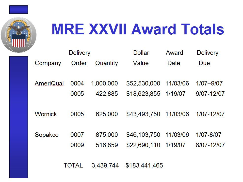 I was hoping to be able to find some recent MRE contract awards and figure out the true cost based on contract award vs. MREs produced - but unfortunately, they don't spell out the exact quantities of MREs per contract: