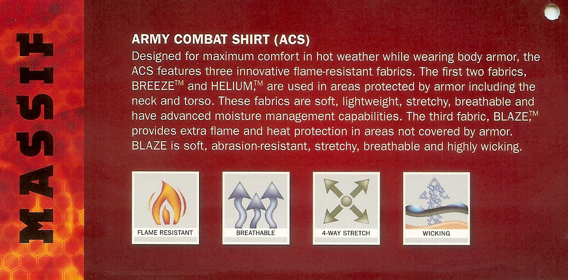 Lorie:Massif wrote:The Army Combat Shirt is approved for use by the Army. It was developed at the Army's request by Massif Mountain Gear Company in an effort to create a lightweight, breathable, flame-resistant shirt for wear under body armor in really hot weather. The torso is a super light, stretch fabric, while the sleeves provide added protection but are still breathable.