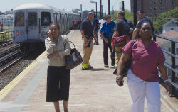 A train was hauled to a stop at the Beach 67 Street platform in Arverne. Fire Department personnel arrive on the scene to help the passengers off the train safely.