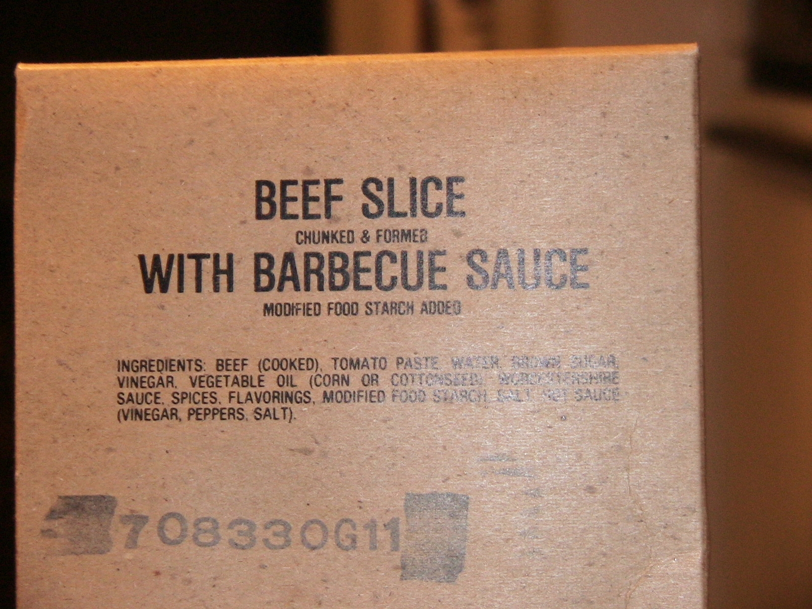 last night i also tried sliced beef with bbq sauce. it had a good flavor. meat was really dry, which is expected. it did leave a tingling metallic aftertaste in my mouth. i ate the whole thing with no side effects. all the beverage bases have turned hard. did not try anything else in it.
