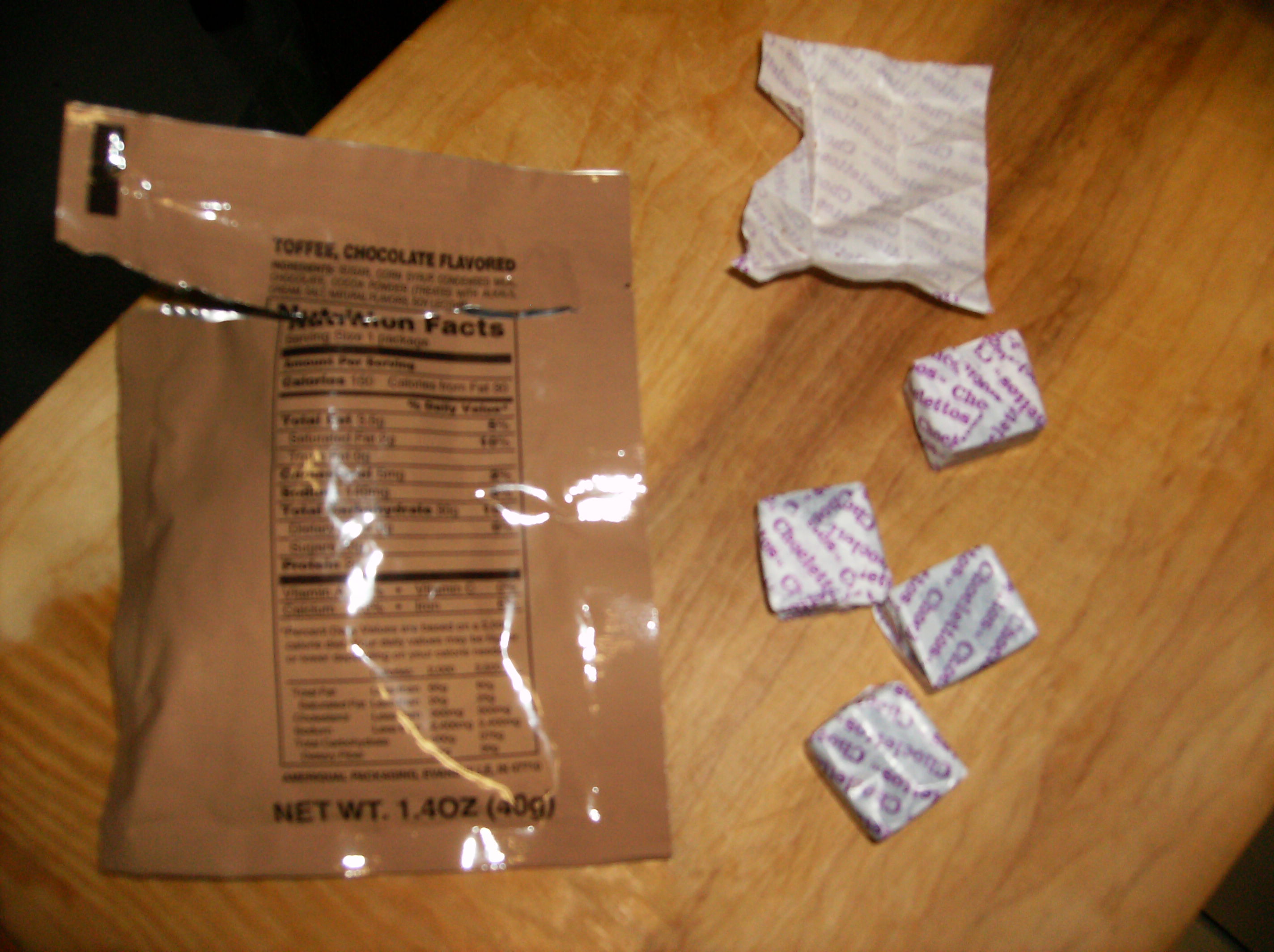 Toffee, Chocolate Coated: These are not like what I had en-visioned in a earlier post. What I found was 5 cubes of chewy chocolate with no toffee taste or toffee bits or anything in them