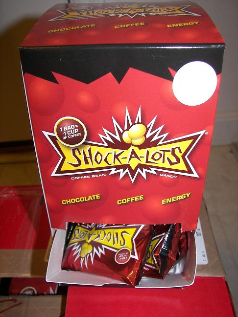 I love those things! I've had chocolate-covered coffee beans before but these are great because they have a hard candy shell around them like M&Ms. Before, if I were to leave a bag of the regular choco-coffee beans in my car in the summer, they'd be a melted mess after one day. But with the Shock-a-lots, as long as that candy shell is intact, they won't melt away.