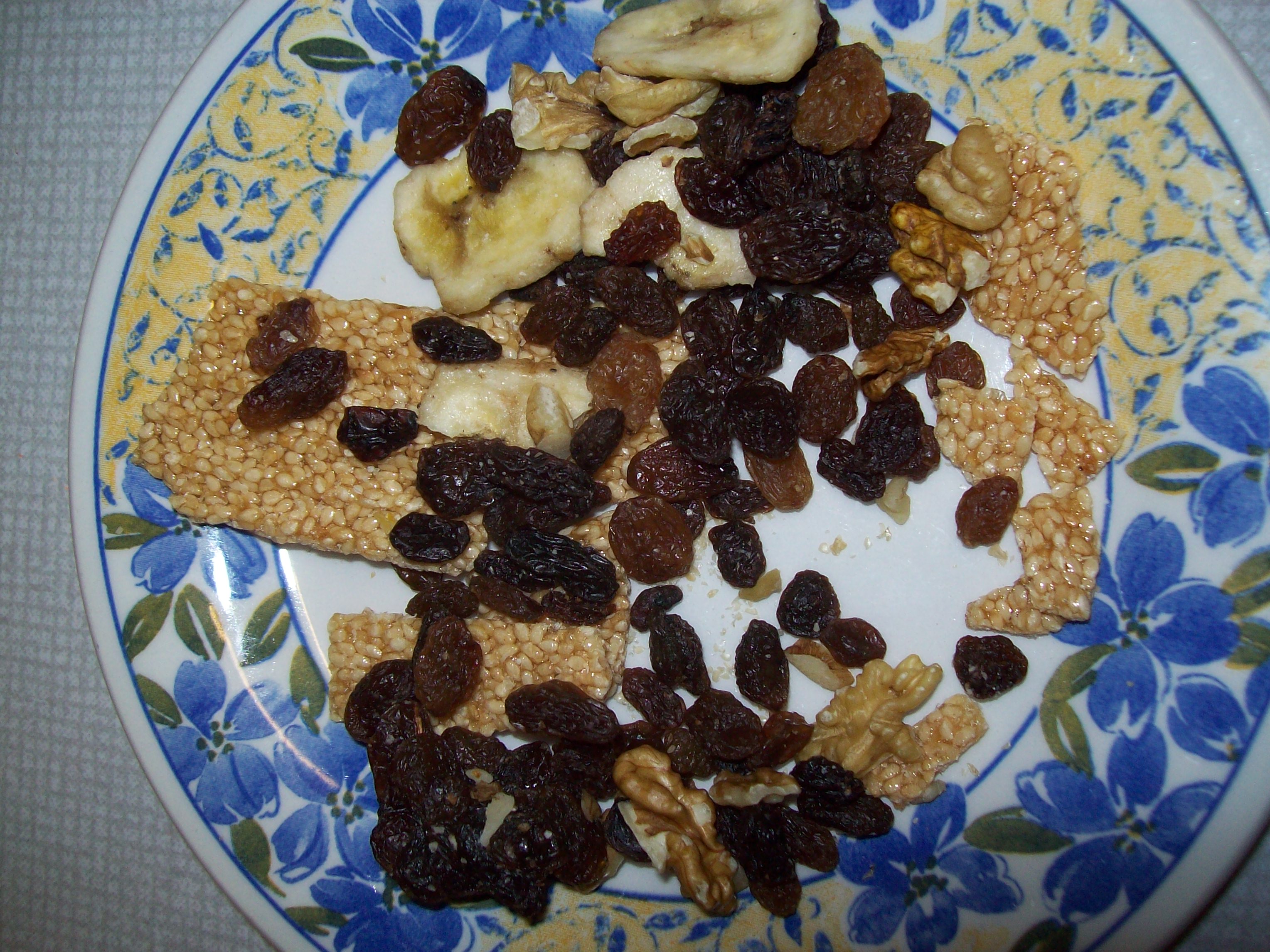 The rasins are fresh, sweet and moist, and the walnuts and banana are crisp. The sesame seed treats had a few holes in the packet when I opened the MRE, but apart from getting seeds all over the floor, the food seems fine.