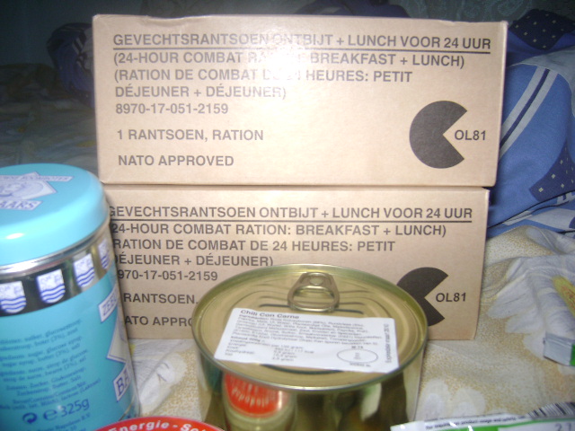 My first ration was dutch, sent by Cracker. I've received 5 until now, I've eaten one and and half (the other half is in an Zip-lock bag, together with an Erbswurst and other items), one unopened box is in my backpack, ready to "deploy" and two are in the closet.