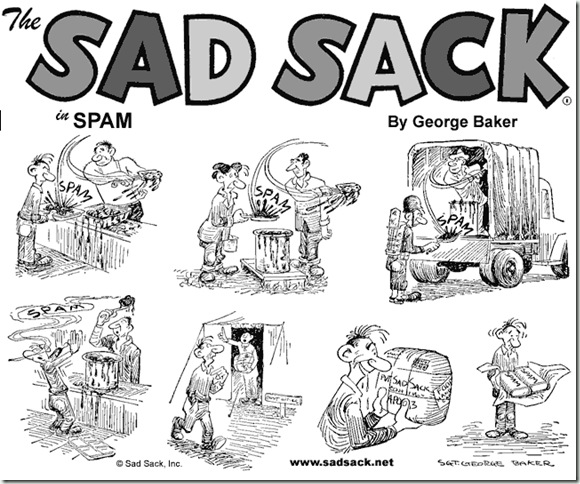 Those pictures of Spam remind me of something. This summer I went to Ontario to visit some family and friends. I had dinner with my mom's brother and his wife. When I got there, he'd already eaten and I was going to have lasagna with Aunt Elza. I said to Harold, "You having soem lasagna with us?" He said, "I wouldn't eat something like that. You have no idea whats in it." I said, "What did you have for dinner?"