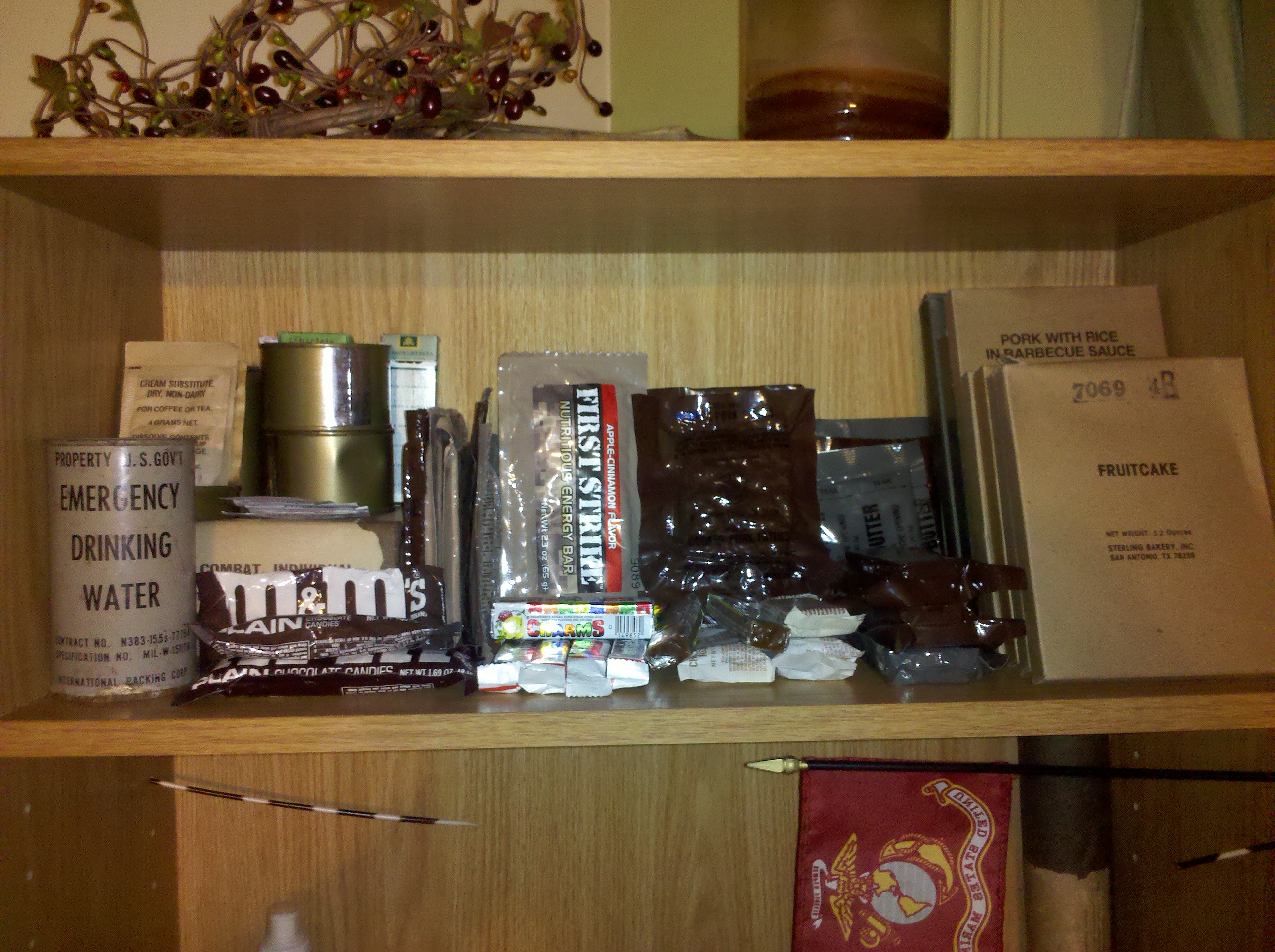 My wife and I have been remodeling our house for some time now. Finally getting finished up I convinced her that all my hard work deserved a small mre shrine in the den. To my surprise she agreed so here is what I have. This in no way compares to Housil and Norge as there collection of spoons would swamp my entire collection. This is not only ration related but also military memorabilia. Most of the old items were my uncles personal affects shipped back from North Africa were he was killed. It is not much but I figured you would enjoy seeing it.