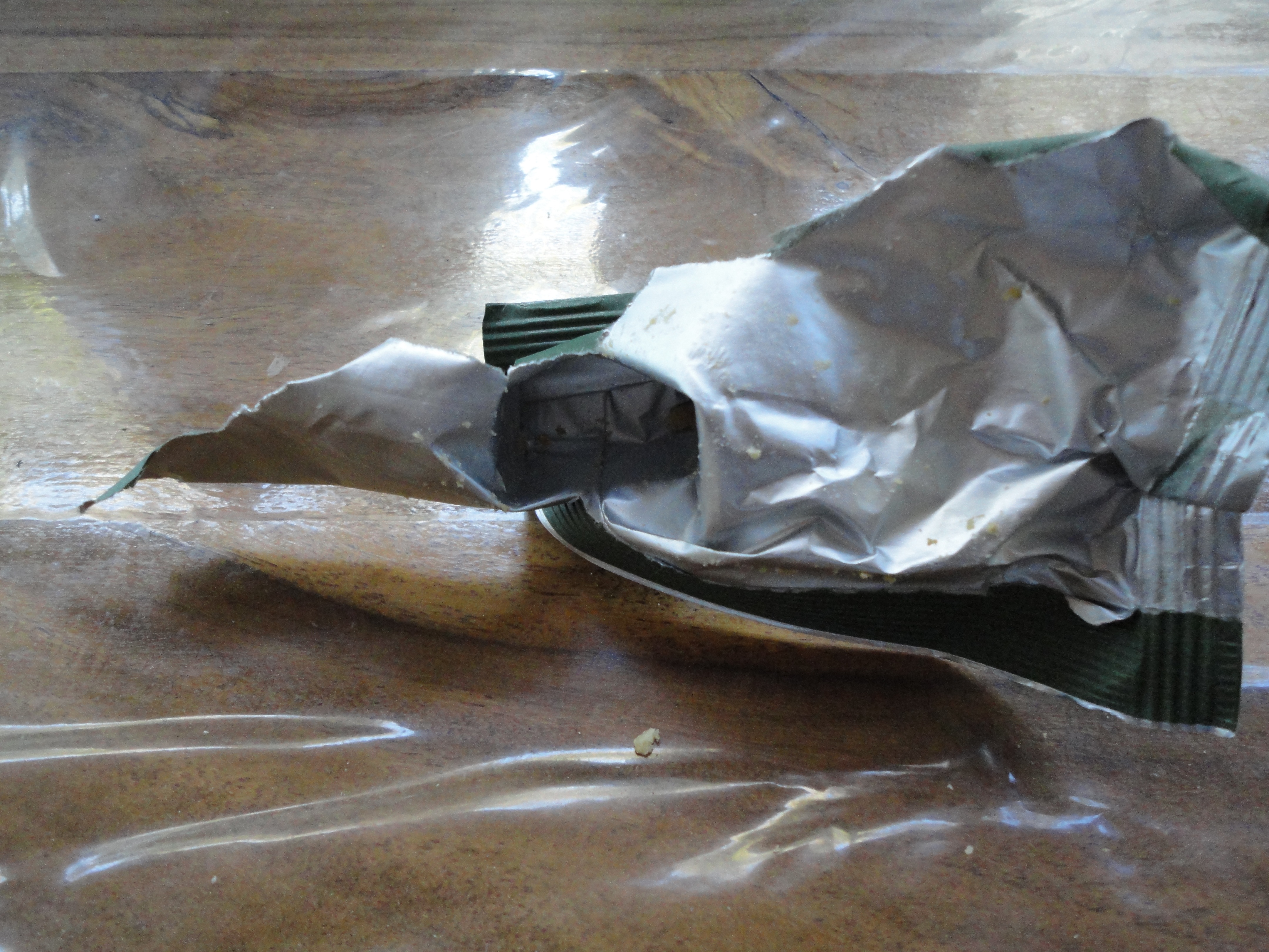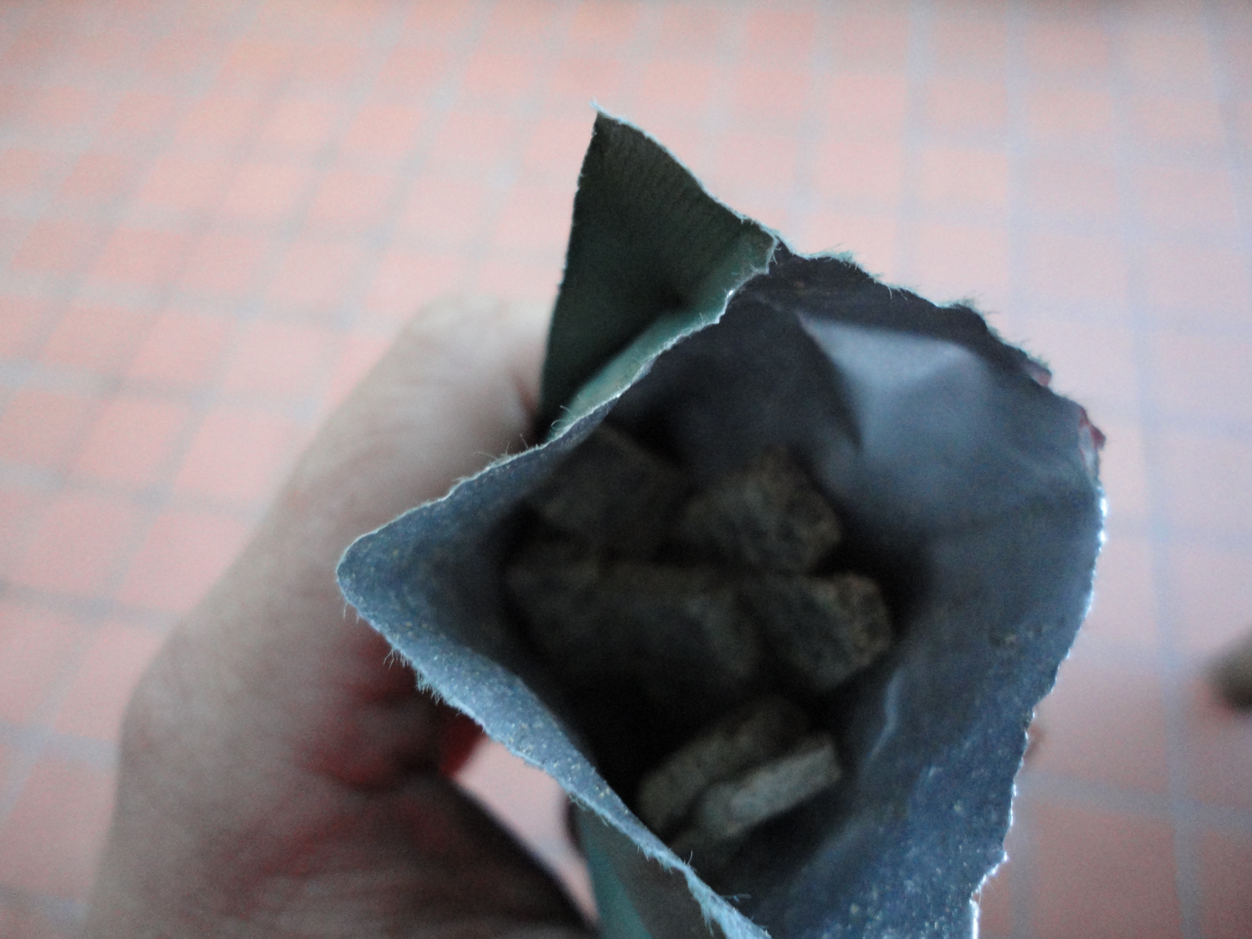 Black unidentifiable pieces orangy smell. Nearly balked at trying this, but in the spirit of adventure., I tried a small piece........