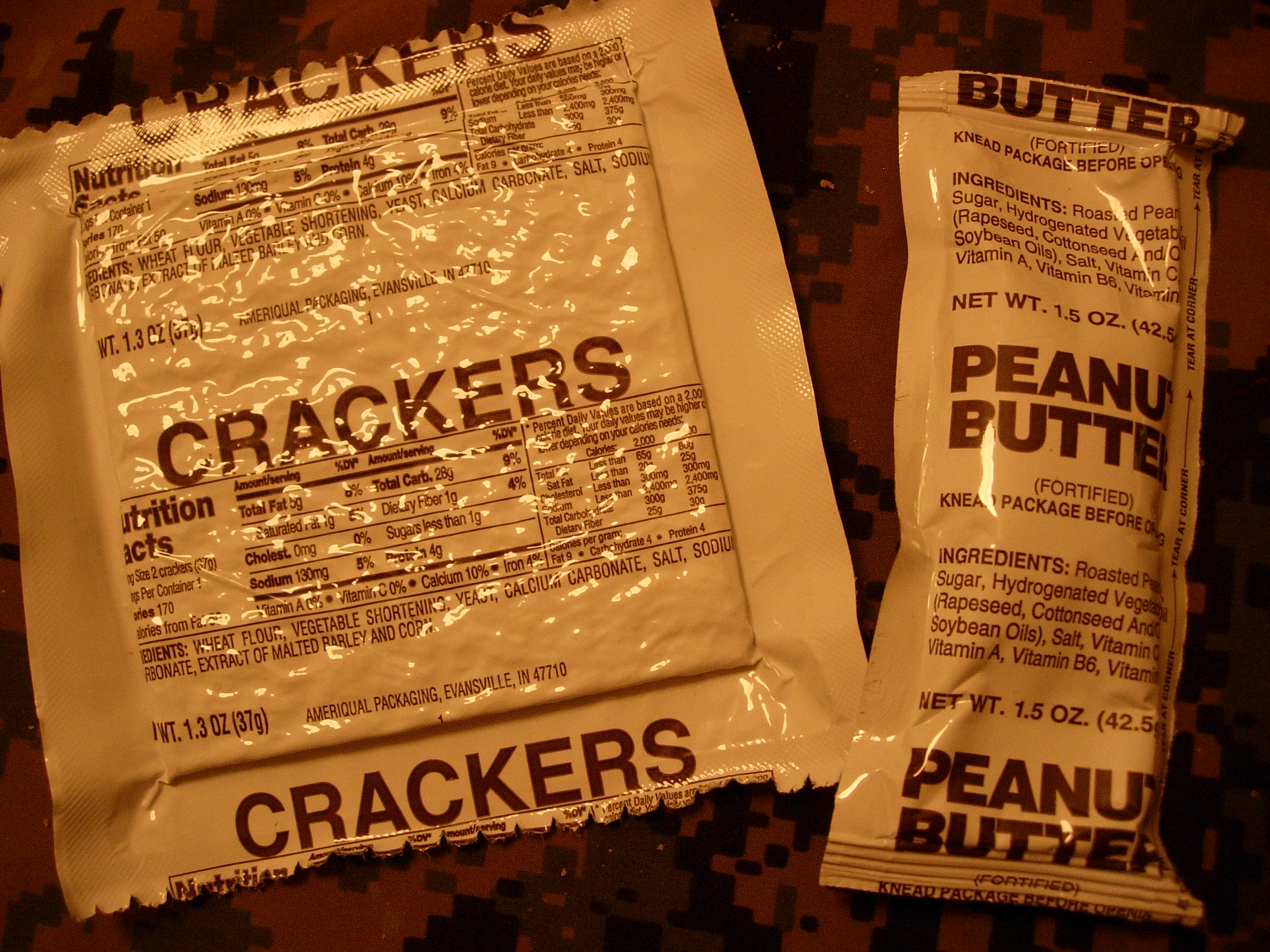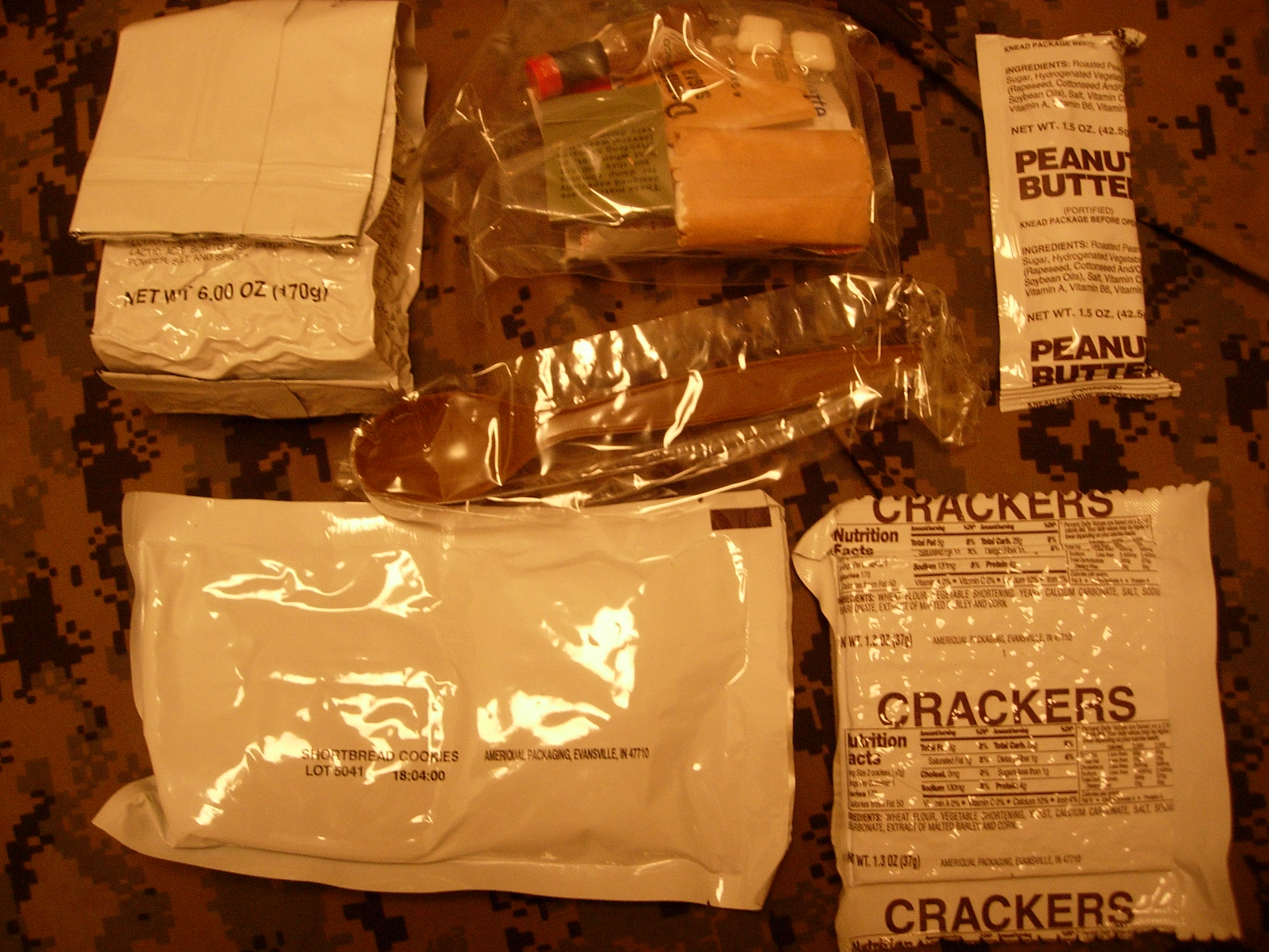 Main Meal, Crackers, Peanut Butter, Shortbread Cookies, Accessory Pack and a Spoon