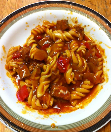 This dish is a nice varity to the other 6 entrees and it´s very typical German. It´s not too hot or spicy, the only drawback is the noodles will get soaked after a too long storage. But this entrees are made to be eaten