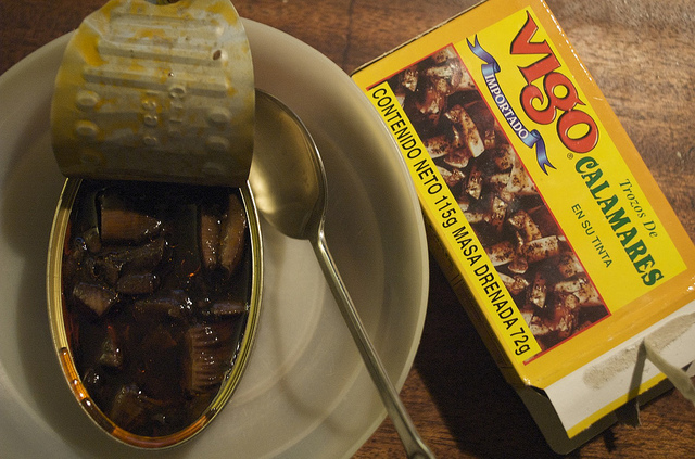 "Pulpo ( octopus) y calamares en su tinta(squid in ink)".... those are tasty but very rare to find here in the US. I get it from the "care packages" from my folks in Puerto Rico. We get them mostly from Spain.Name_not_found wrote:Eel, Squid, octopus, in a can not so normal/common
