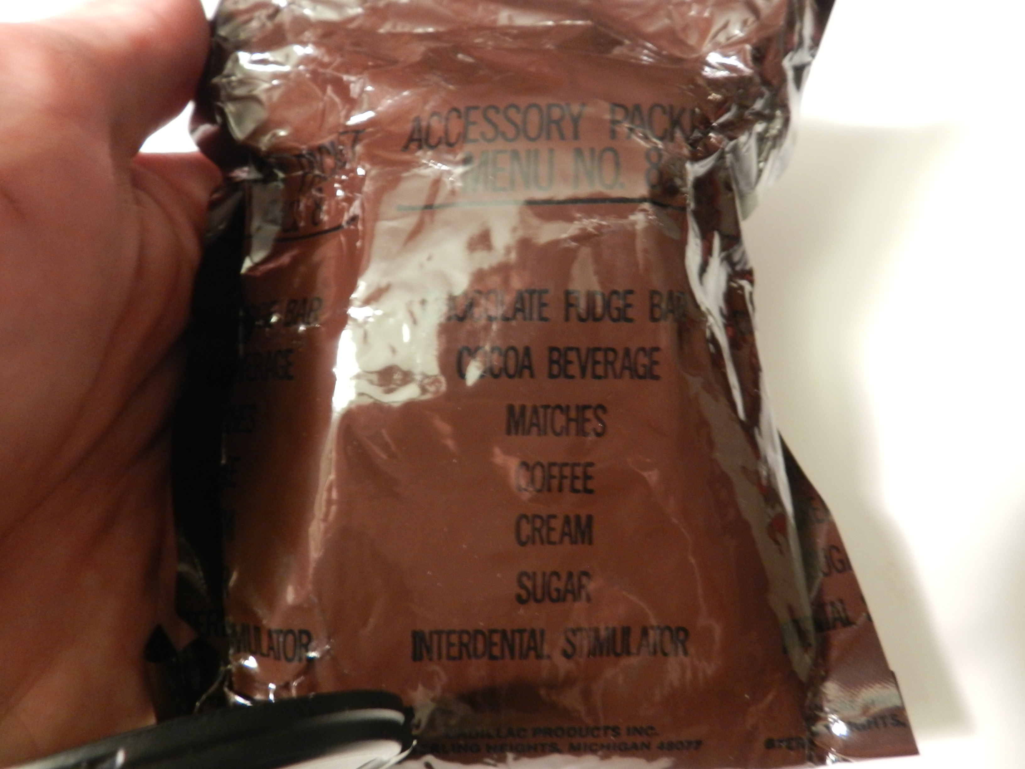 There was no interdental stimulator in the packet. This applies for any other time I open an old ration accessory packet the Interdental Stimulator is never there! Robbery, I say! heh