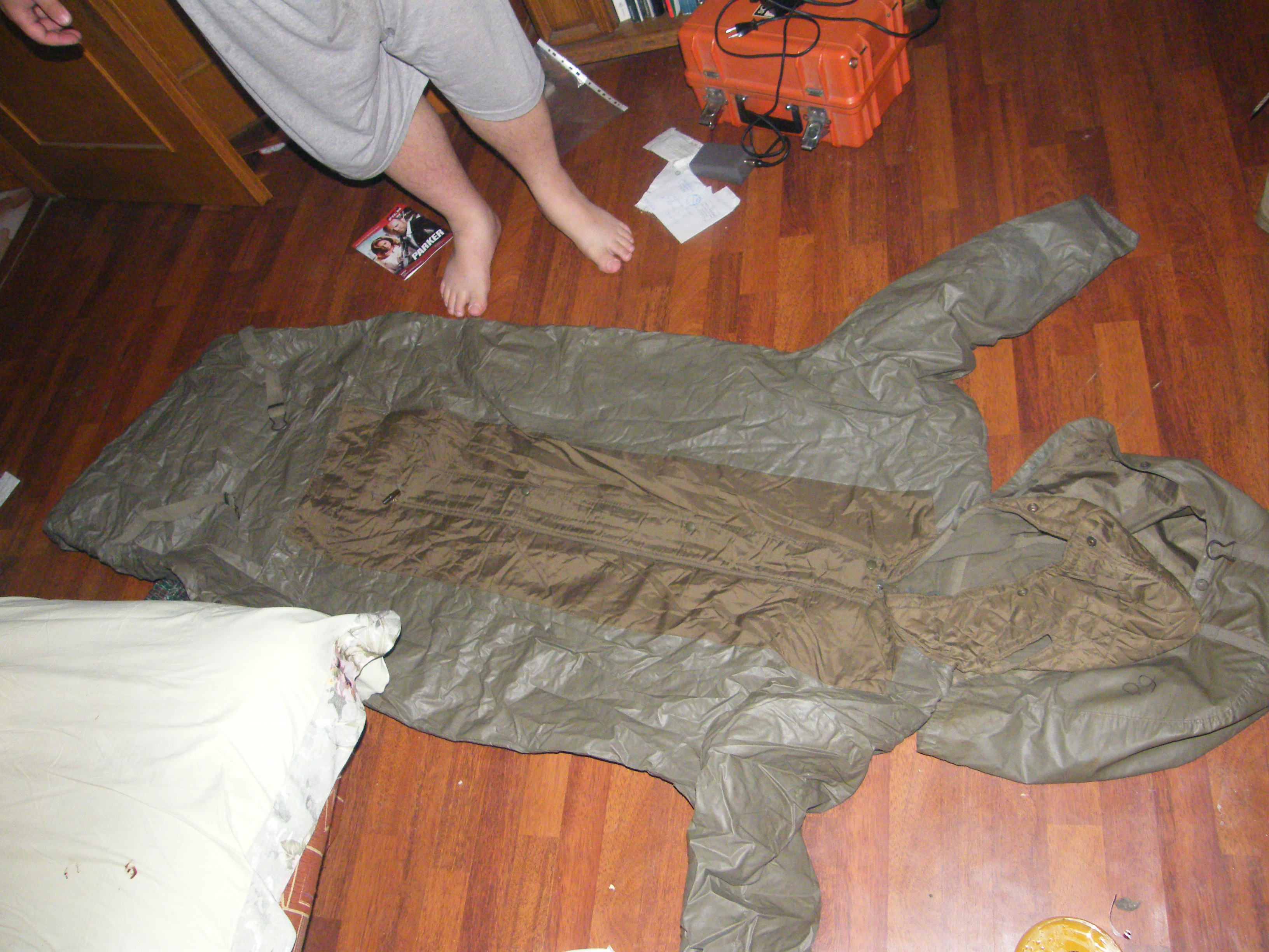 Yesterday I got first present for my next birthday, a german sleeping bag with sweeves and opening for legs, outer side is somewhat rubberised. If someone can give me some intel about it, I attach some pictures: