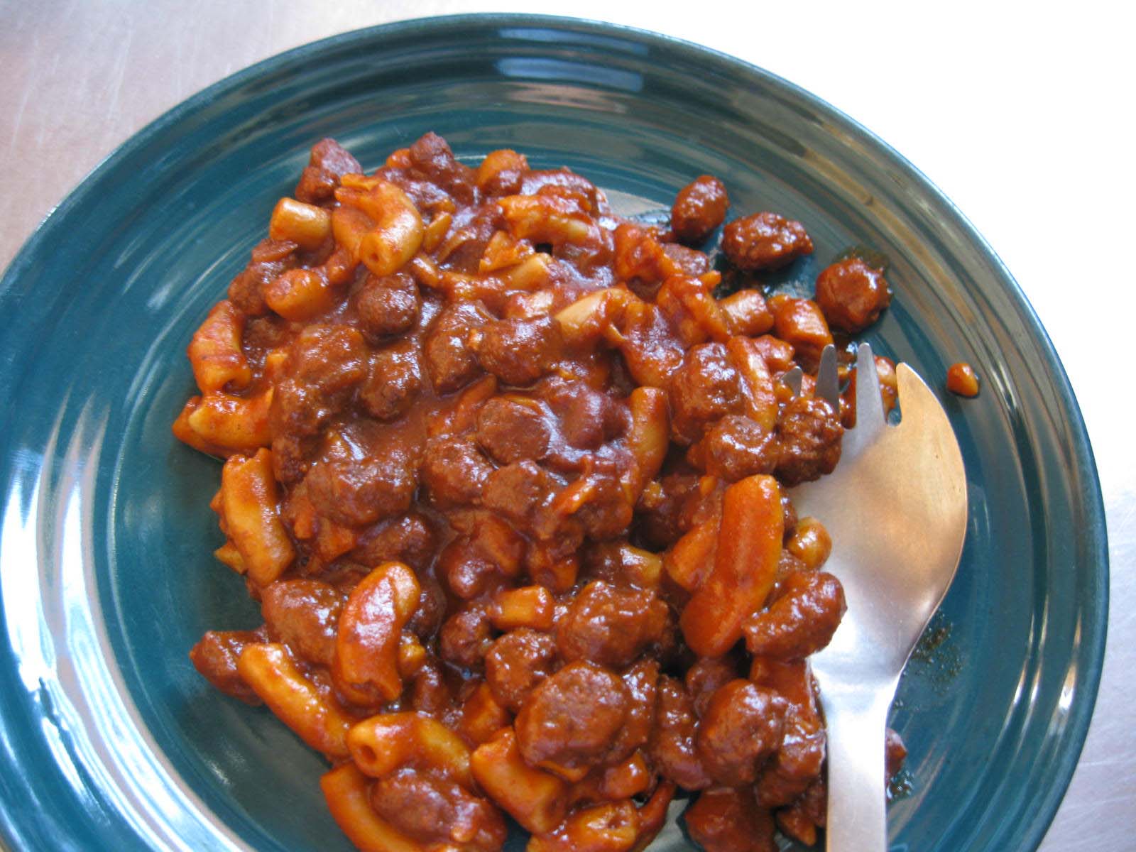 Despite being eight years old, there was no sign of the deterioration, either in the consistency or the flavor. Just a quick stirring and it was good to go. The meat nuggets are about the size of garbanzo beans and are pretty plentiful. They are much the same as the sausage pellets that some cheapo pizza joints use these days. You won’t mistake them for hamburger, but they certainly are meat flavored and they have a “meaty” texture. The macaroni were perfectly fine, were not too mushy and the balance between the solids and the sauce was very good.