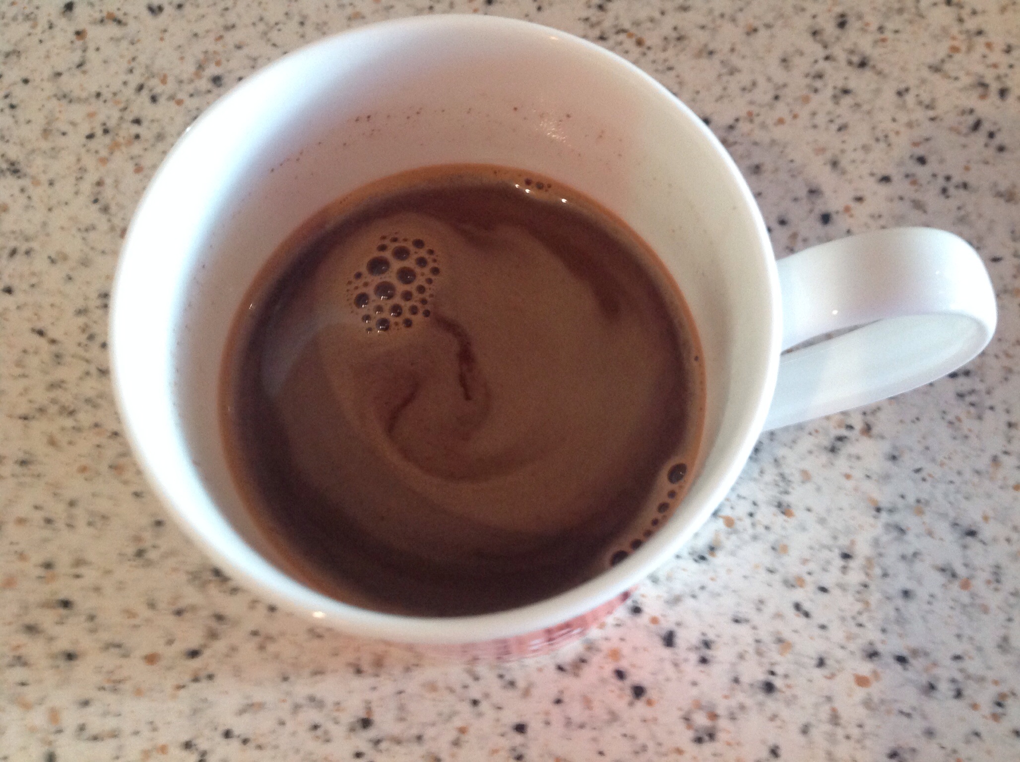 Coffee, Cacao Beverage (Hot Chocolate), Muesli aux fraises, 2 packs of sweet biscuits (from 4 packs) and I'm going to wash it all down with Peppermint tea.