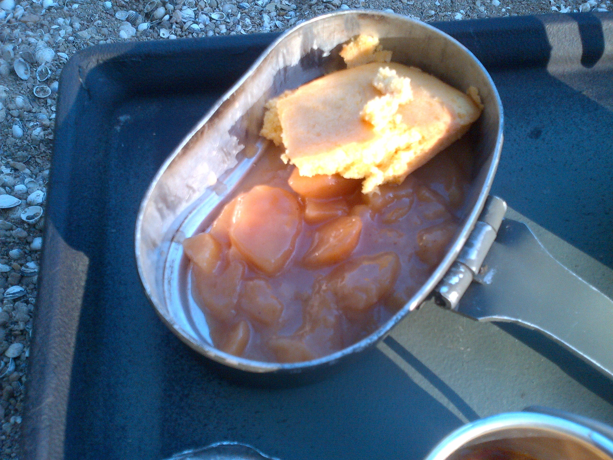 One of the best I have eaten from a field ration. It would have went well with a Hot cup of coffee. But it is July and Coffee at 7.00 PM on river in July is not what you want. As for this curry , my thoughts after trying it are, it would be a very good base for canned chicken. Or combined with the MRE beef patty and the Mc Rib pork entree. The Japaneses spoon this over rice, but for me Potatoes and rice don't go together. This would go well with meat