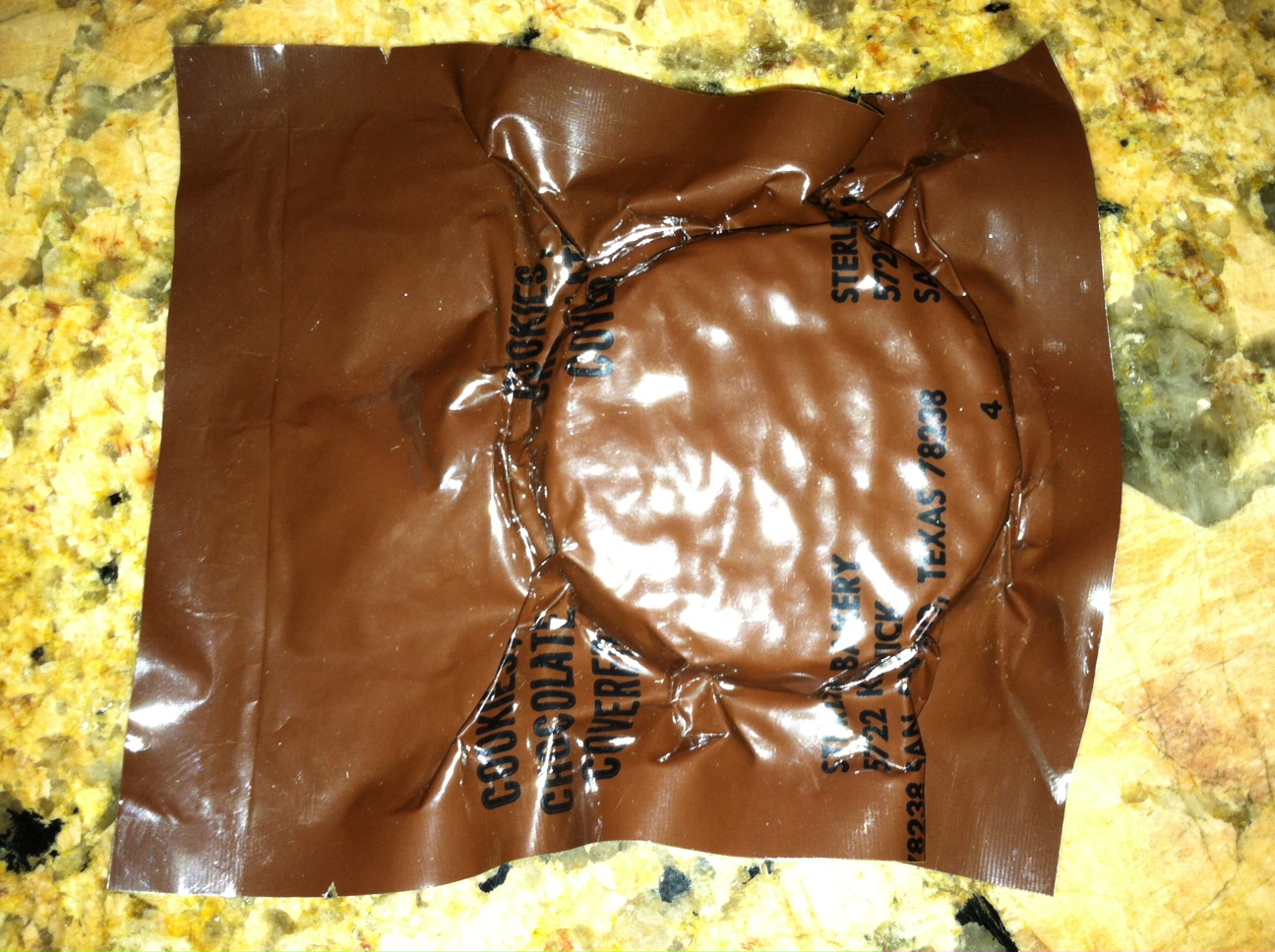 Smell: Odd MRE smell, I think this was from the packaging and not the cookie. Smells kind of like recycled paper, I recall some of the older MRE's smelling like this due to the plastic or packaging.