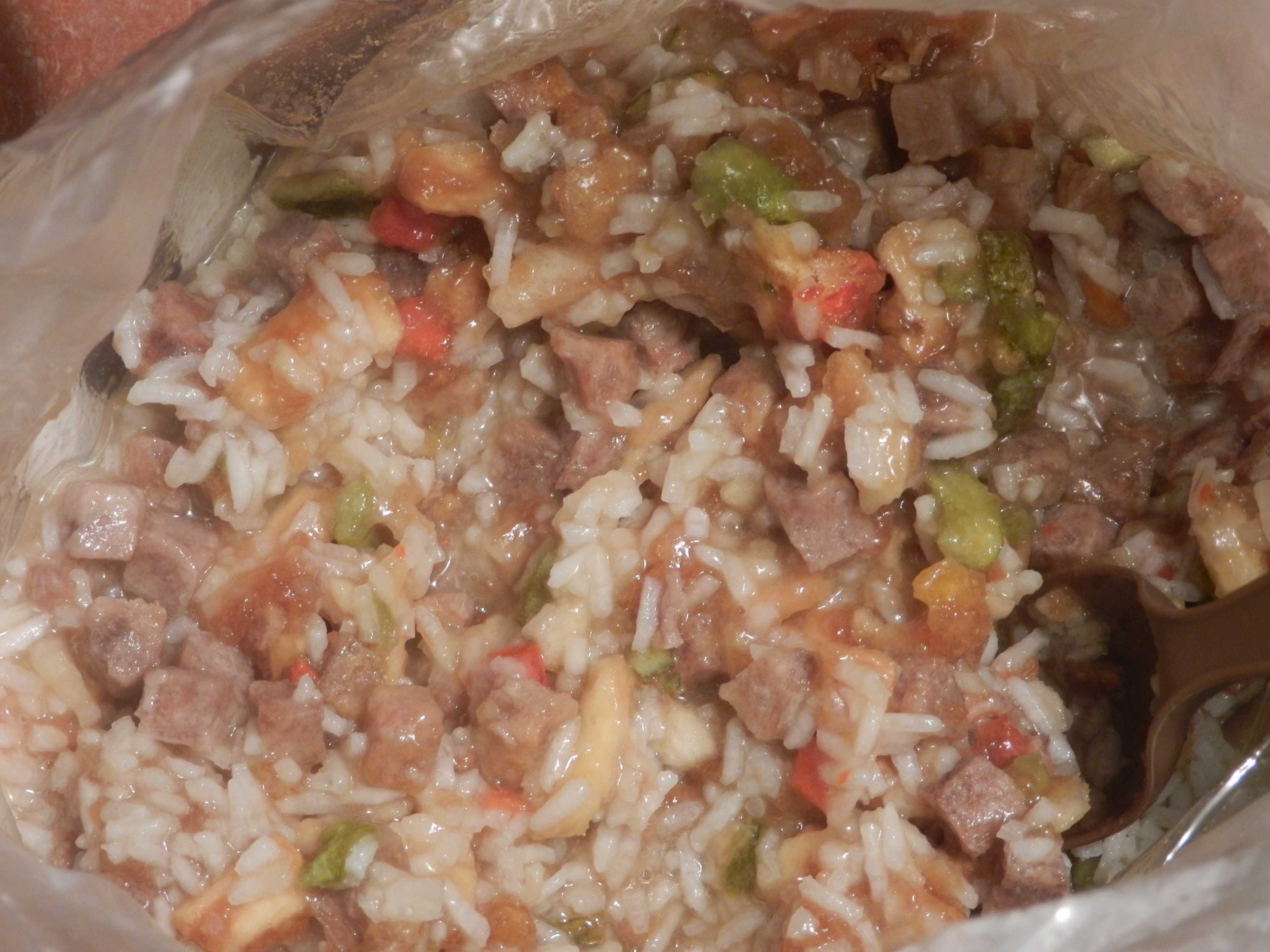 Here's a gem that isn't produced anymore - Sweet & Sour Pork Long Range Patrol Ration from 1998. First off, this is no cheap entree, it has complex flavors and is sweet.. literally! With the pineapple accompanying the pork & rice, it gives such a pleasant & easy to eat sortof way about it. It's like instant Chinese food - or better yet, some kinda Hawaiian dish.