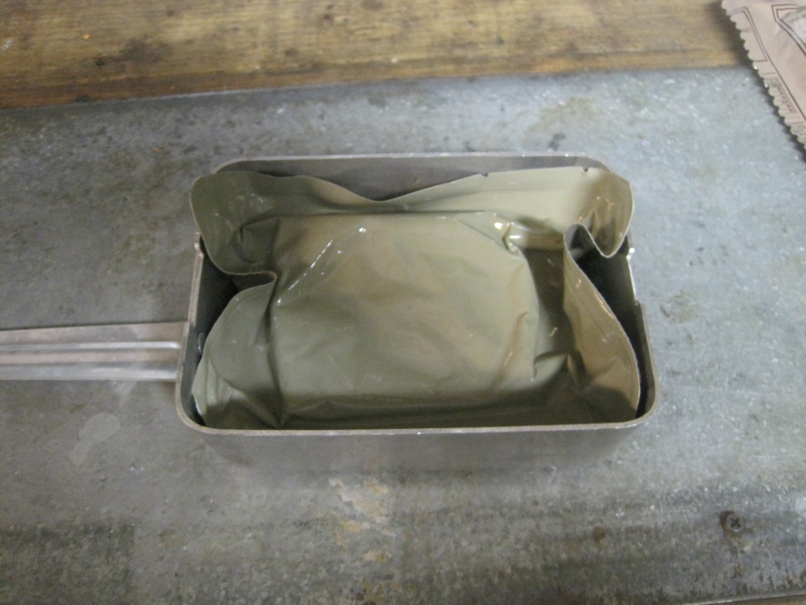 Rattattoo Here is one section of what I think is a French mess tin set. It can hold a MRE pork patty flat .rattattoo wrote: I'm on the lookout for some sort of a shallow rectangular, aluminum pan that I can put directly over my little stoves and just drop an MRE in a 1/2" of H20 in that. I almost always take along the stove so that I can have a hot hot hot beverage.