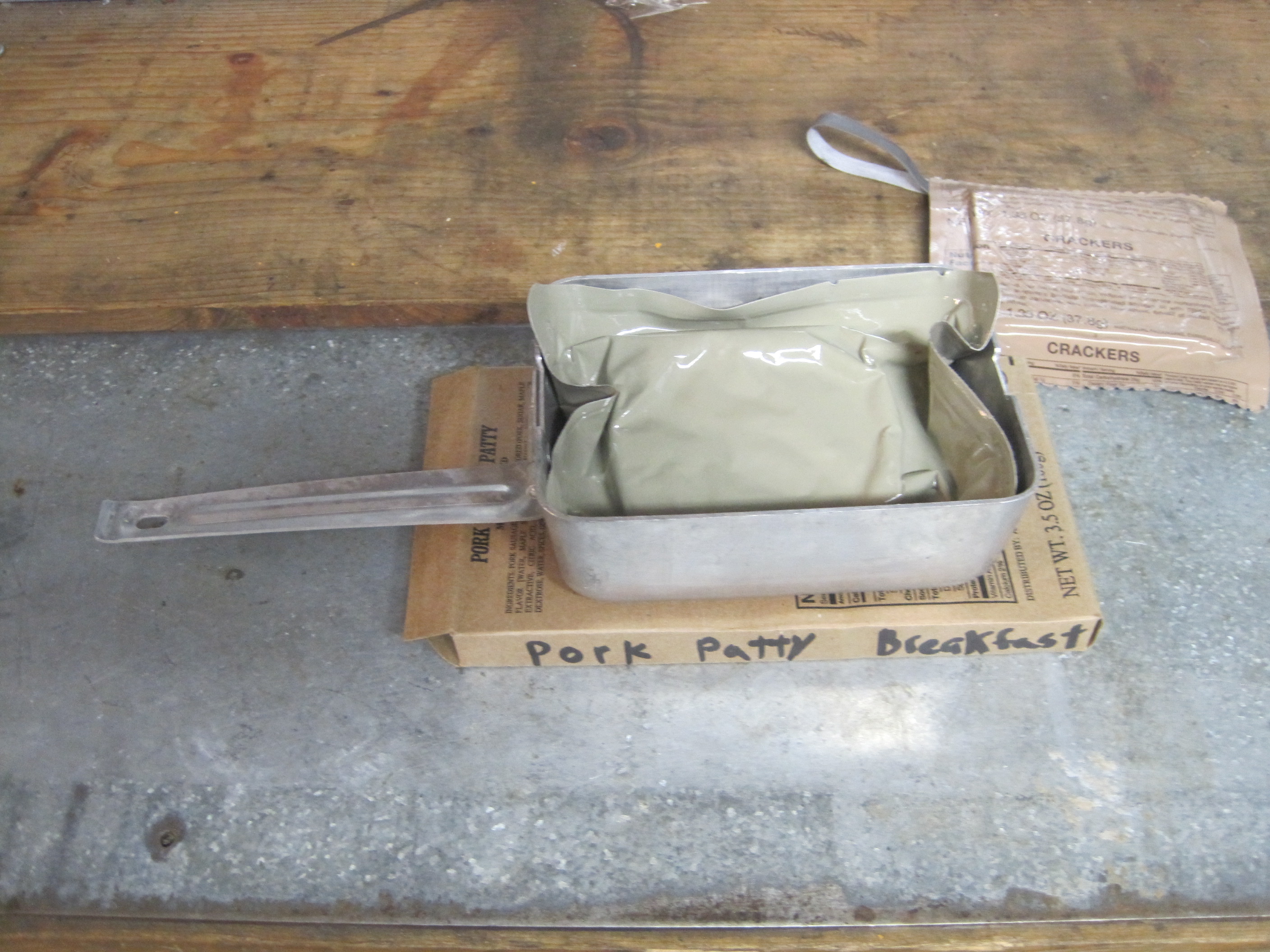 Rattattoo Here is one section of what I think is a French mess tin set. It can hold a MRE pork patty flat .rattattoo wrote: I'm on the lookout for some sort of a shallow rectangular, aluminum pan that I can put directly over my little stoves and just drop an MRE in a 1/2" of H20 in that. I almost always take along the stove so that I can have a hot hot hot beverage.